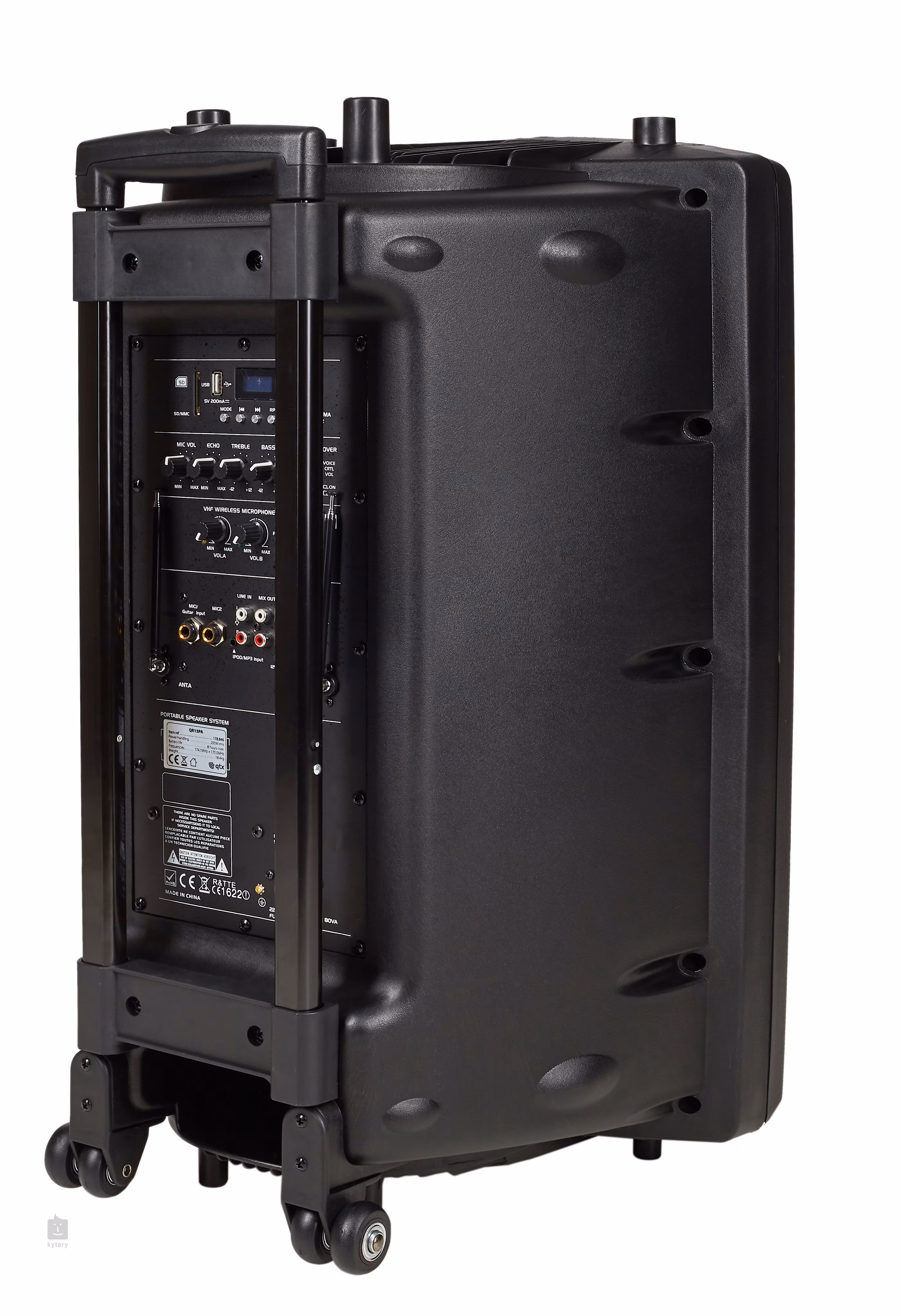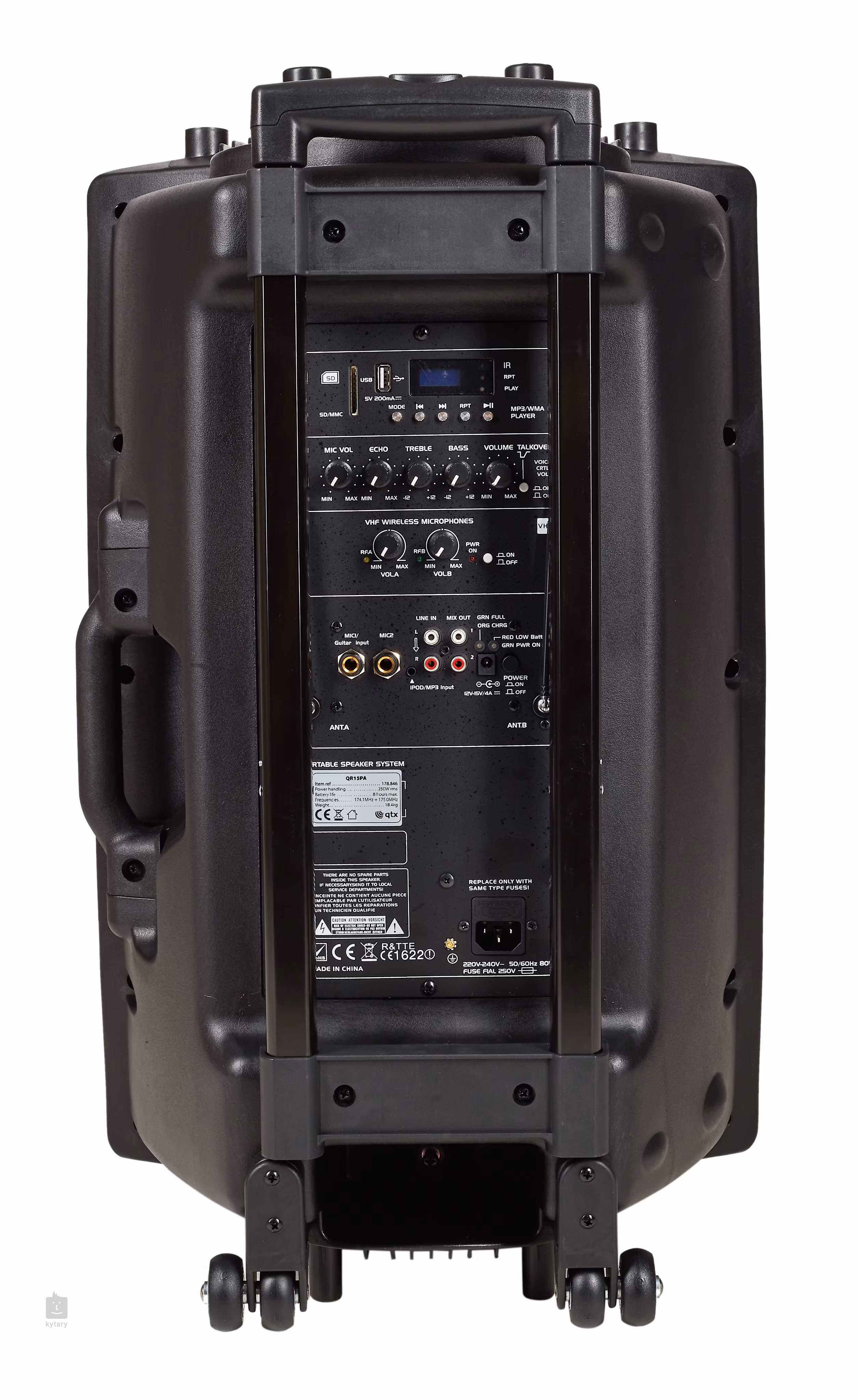 12“ aktivní plastový reprobox s USB portem a slotem pro SD karty. Výkon 300W, vstupy: mikrofonní XLR/Jack, linkový XLR/RCA, výstup XLR/Jack. Regulace úrovně signálu všech vstupních a výstupních kanálů, 2-pásmové korekce, LED indikace zapnutí a přetížení, ovládací panel MP3 přehrávače.