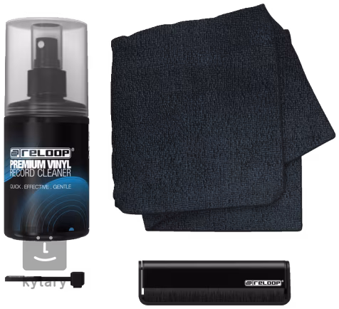 Le kit comprend : 1x 200 ml de spray nettoyant pour vinyles et CD, 1x chiffon antistatique en microfibres (30 × 30 cm), 1x Reloop Premium Stylus Brush et 1x Reloop Premium Carbon Fibre Brush.