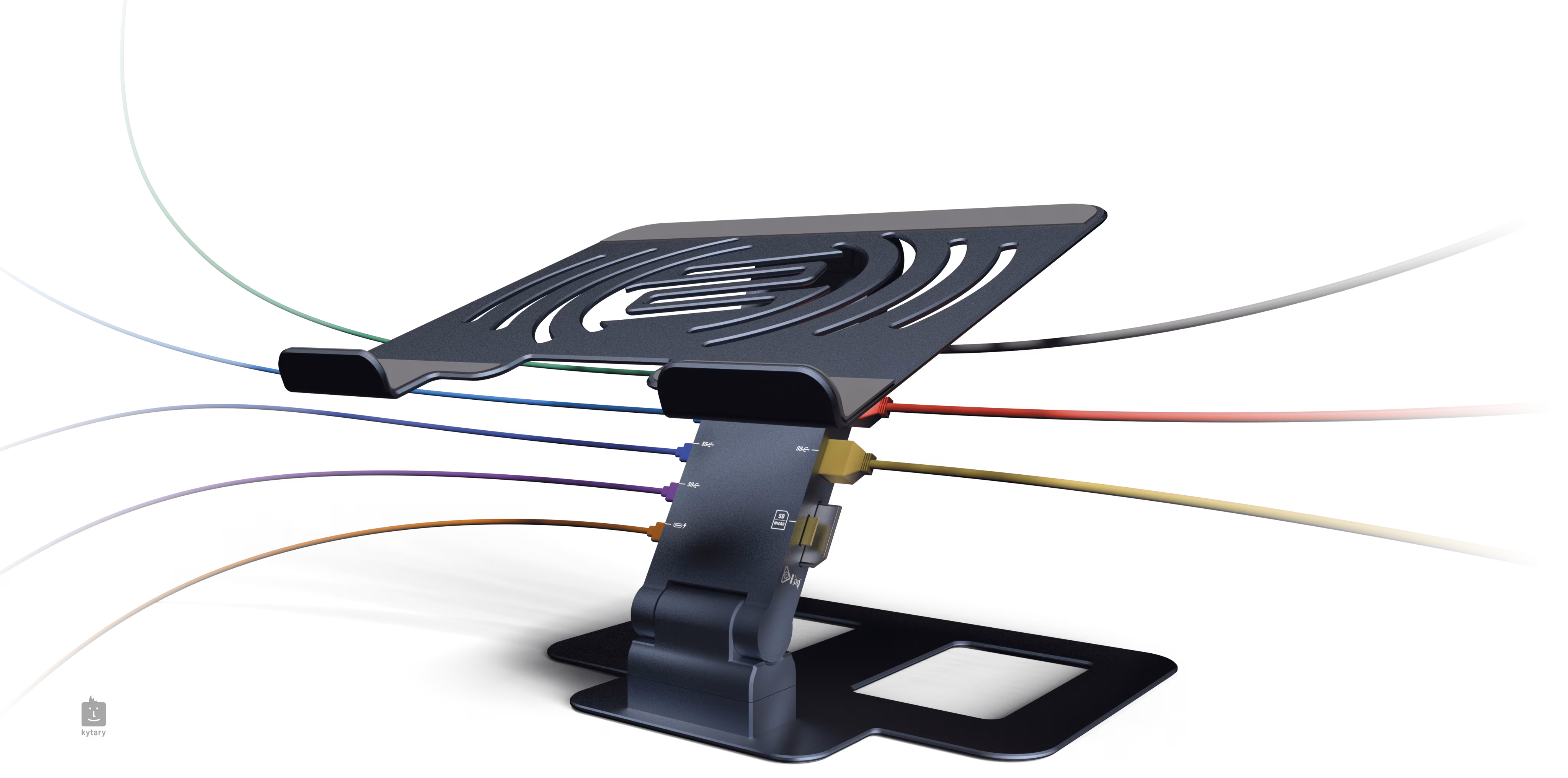 Le support en aluminium ultrafin, léger et durable combine une capacité de charge maximale avec des caractéristiques pratiques d'économie d'espace. La base pivotante permet un positionnement ergonomique individuel sur 360°, un réglage infini et la possibilité d'un ancrage sûr grâce à des vis de montage encastrées. Des patins antidérapants sous la base et un rembourrage en caoutchouc sur le dessus protègent les ordinateurs portables ou les tablettes (8" - 15").