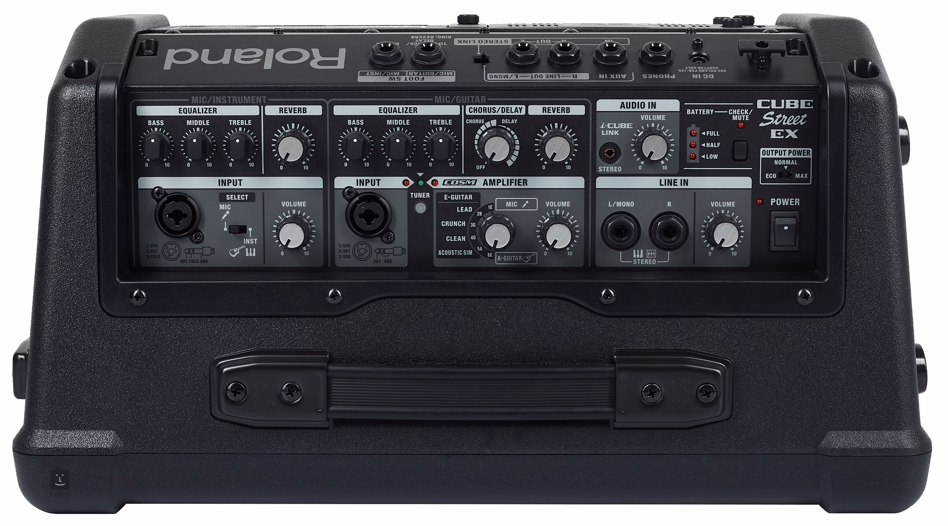 A côté, on trouve les éléments nécessaires au contrôle du canal micro ou guitare. Sur la rangée du bas, a côté de l'entrée XLR Combo-Jack, vous trouverez un commutateur entre les quatre modes du son de la guitare, le mode instrument et les potentiometres du préampli micro réglant sa distorsion et son volume. Avec des modes basés sur des amplis de guitare légendaires ou sur les effets de distorsion les plus populaires de Boss, le Cube offre tout, des superbes sons clairs, y compris la simulation de guitare acoustique, a l'overdrive léger et au hi-gain bien épais.
