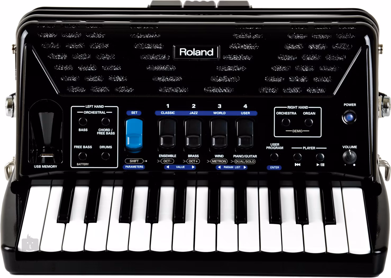 Le V-Accordion a révolutionné le monde de la musique et Roland s'est désigné comme le développeur de ces grands instruments. La série FR-1x est le dernier né de la célebre famille des V-Accordion. Ces modeles compacts et légers offrent la meme flexibilité et la meme portabilité que leur prédécesseur populaire, le FR-1, mais ajoutent des caractéristiques supplémentaires importantes, notamment des fonctions USB et un contrôle avancé de la pression du soufflet, garantissant une sensibilité et une précision exceptionnelles. Avec une nouvelle génération de haut-parleurs intégrés et un écran plus grand de 7 segments/3 caracteres, le FR-1x Piano et le FR-1x Button établissent une nouvelle norme pour les accordéons petits et légers.