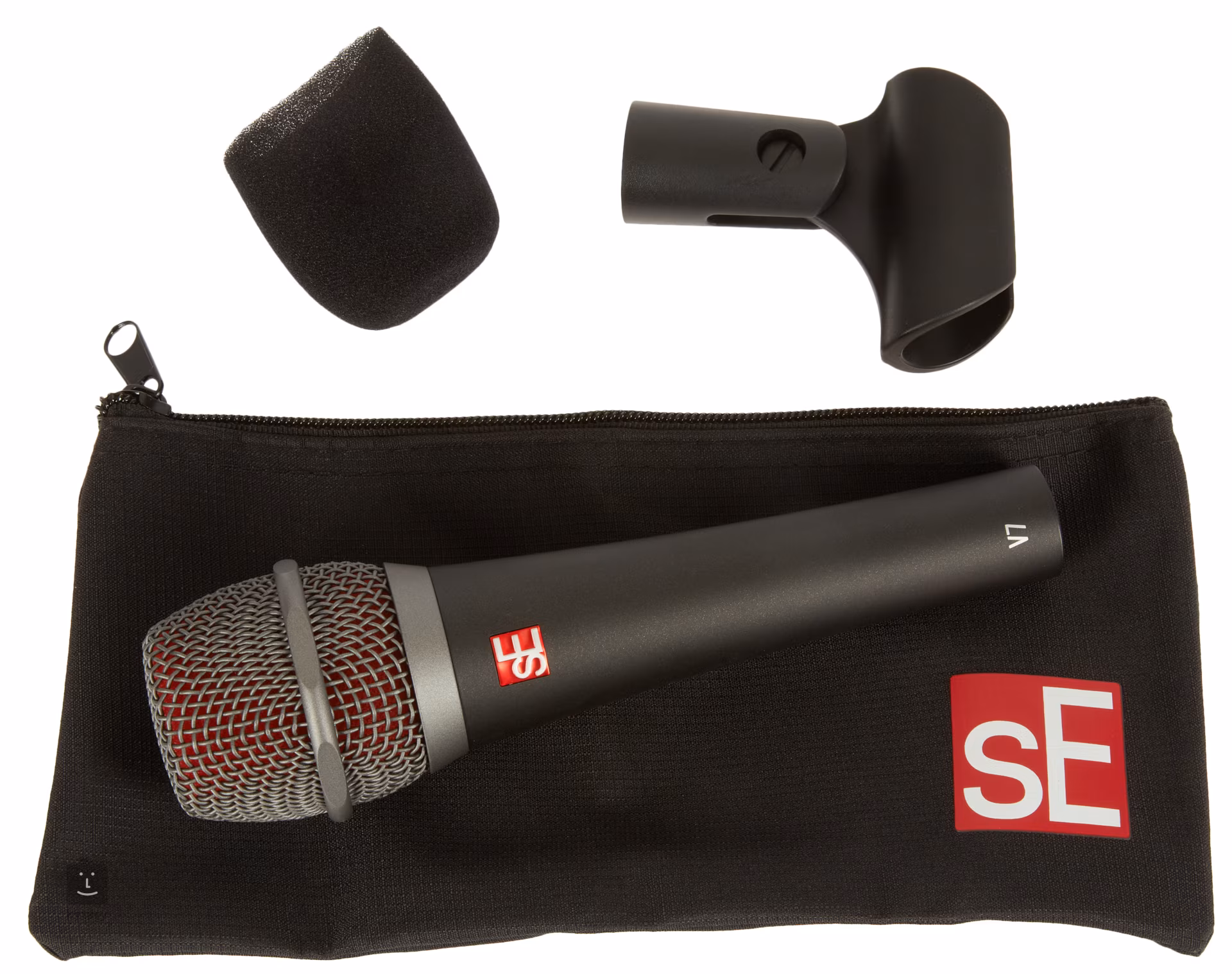 Un étui de transport et un support de microphone sont inclus.