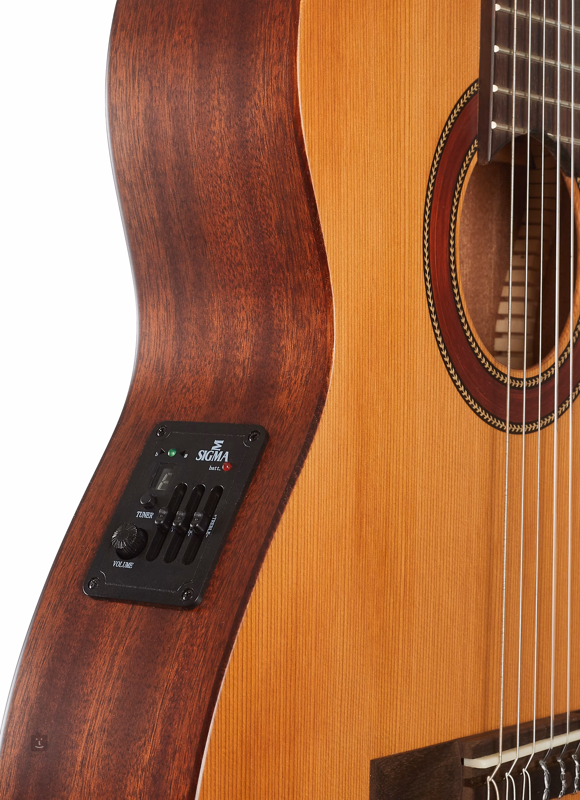 La Sigma CTMC-2E est une guitare électroacoustique classique plus moderne qui convient aux débutants et aux musiciens expérimentés. Elle présente un corps semi-massif plus étroit (80 mm de profondeur) composé d'une façade en cedre massif et d'un fond et de côtés en acajou. Une touche en palissandre équipée de dix-neuf frettes est collée sur le manche plus étroit en acajou (la largeur de la frette zéro correspond a 47,63 mm).