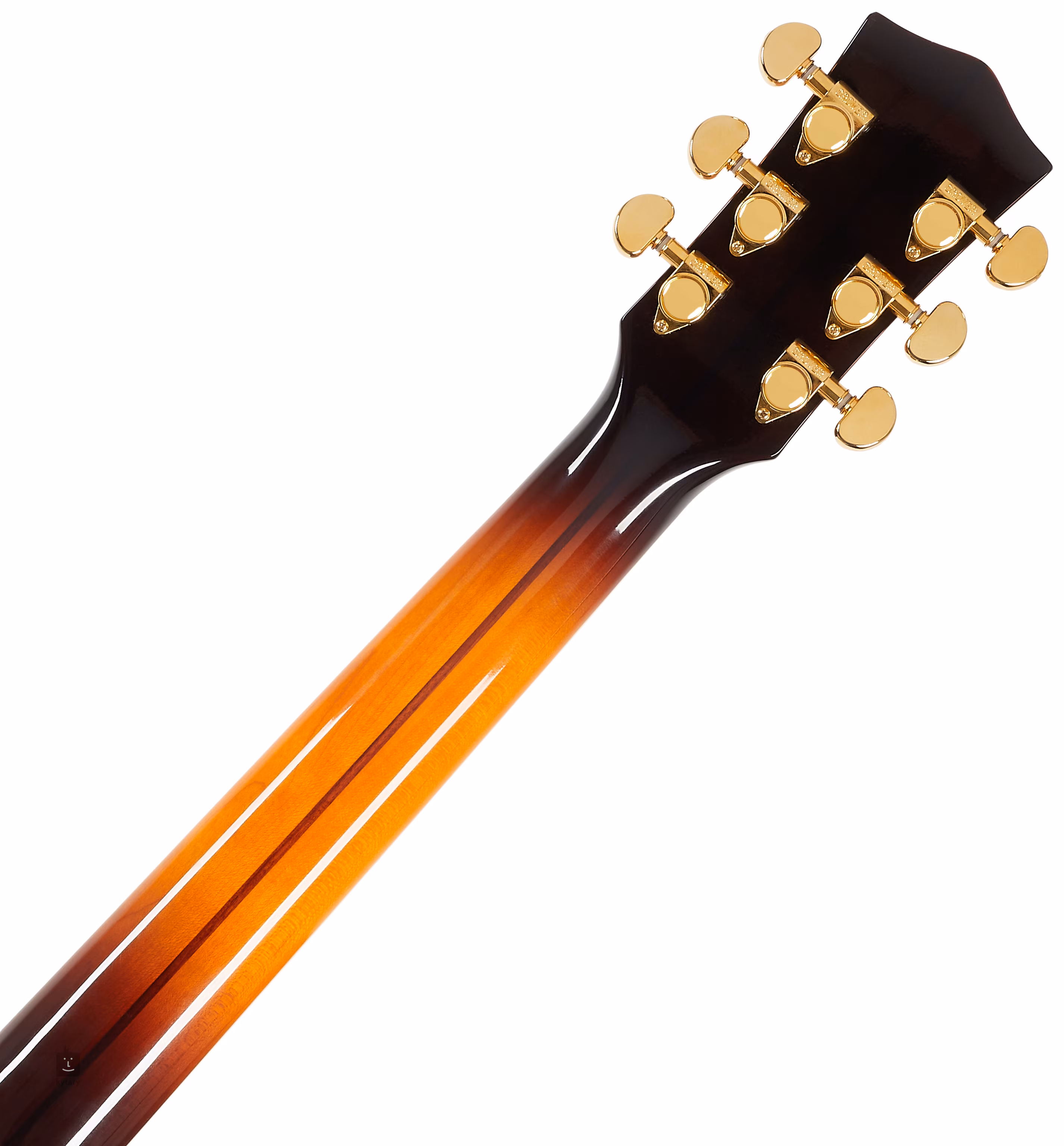 La façade de la guitare est fabriquée en épicéa Sitka massif, tandis que le fond et les éclisses sont en érable flammé massif, le grain du bois étant soutenu par une finition Vintage Sunburst. Une touche en ébène est collée sur le manche en acajou, qui est fixé au corps avec un joint de manche en queue d'aronde à la 14e frette en standard. L'orientation autour de la surface de la touche est facilitée par des repères de position décoratifs en forme de couronnes.