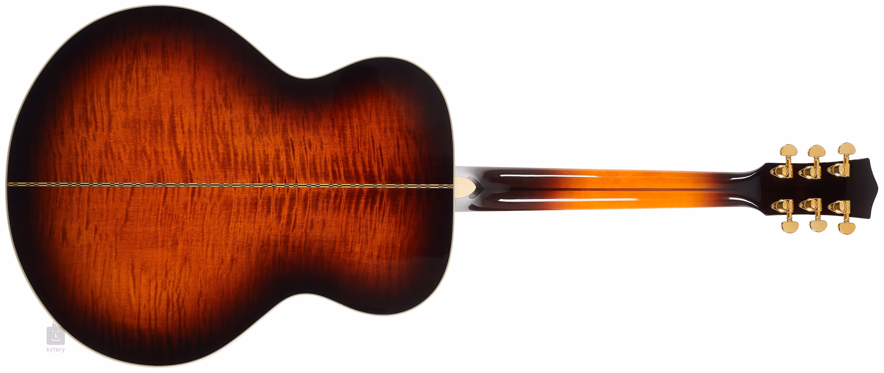 Les cordes sont montées dans des mécanismes Grover Die-Cast en finition dorée et la touche en ébène. La frette zéro et le sillet en os compensé garantissent une transmission idéale des vibrations des cordes. La beauté de la fabrication est accentuée par la finition brillante brunie du corps, le pickguard décoré de motifs graphiques familiers aux modèles Gibson SJ-200, la touche en forme de moustache, la bordure périphérique double face du corps, la décoration de la plaque arrière et le logo de la société et le motif en nacre sur la tête.