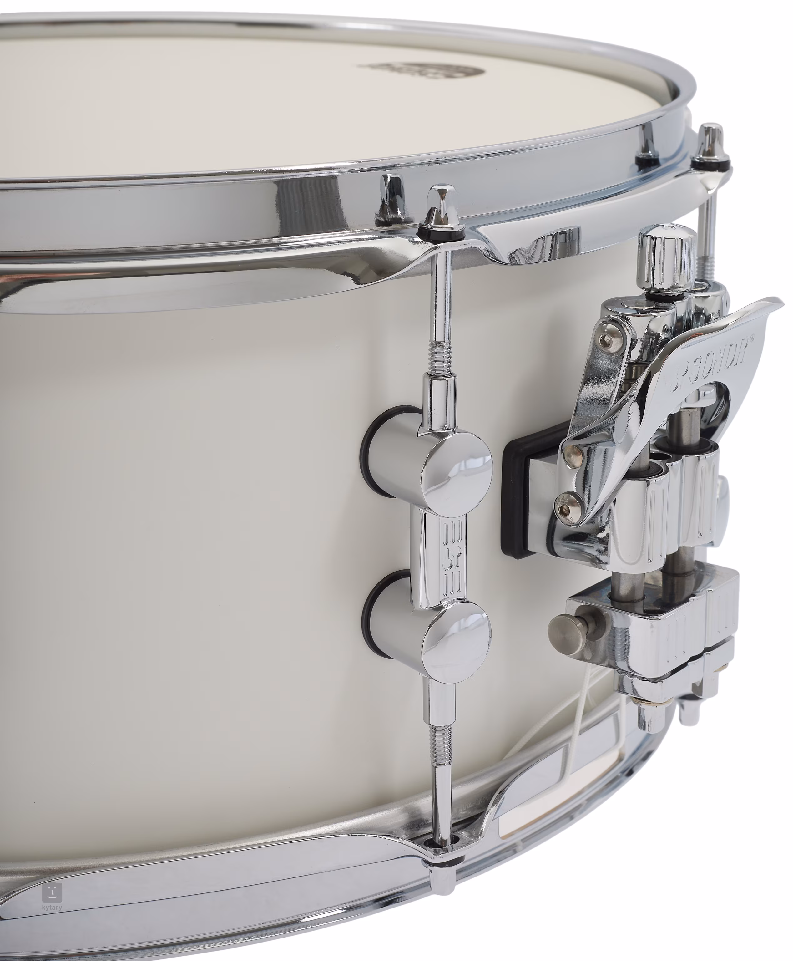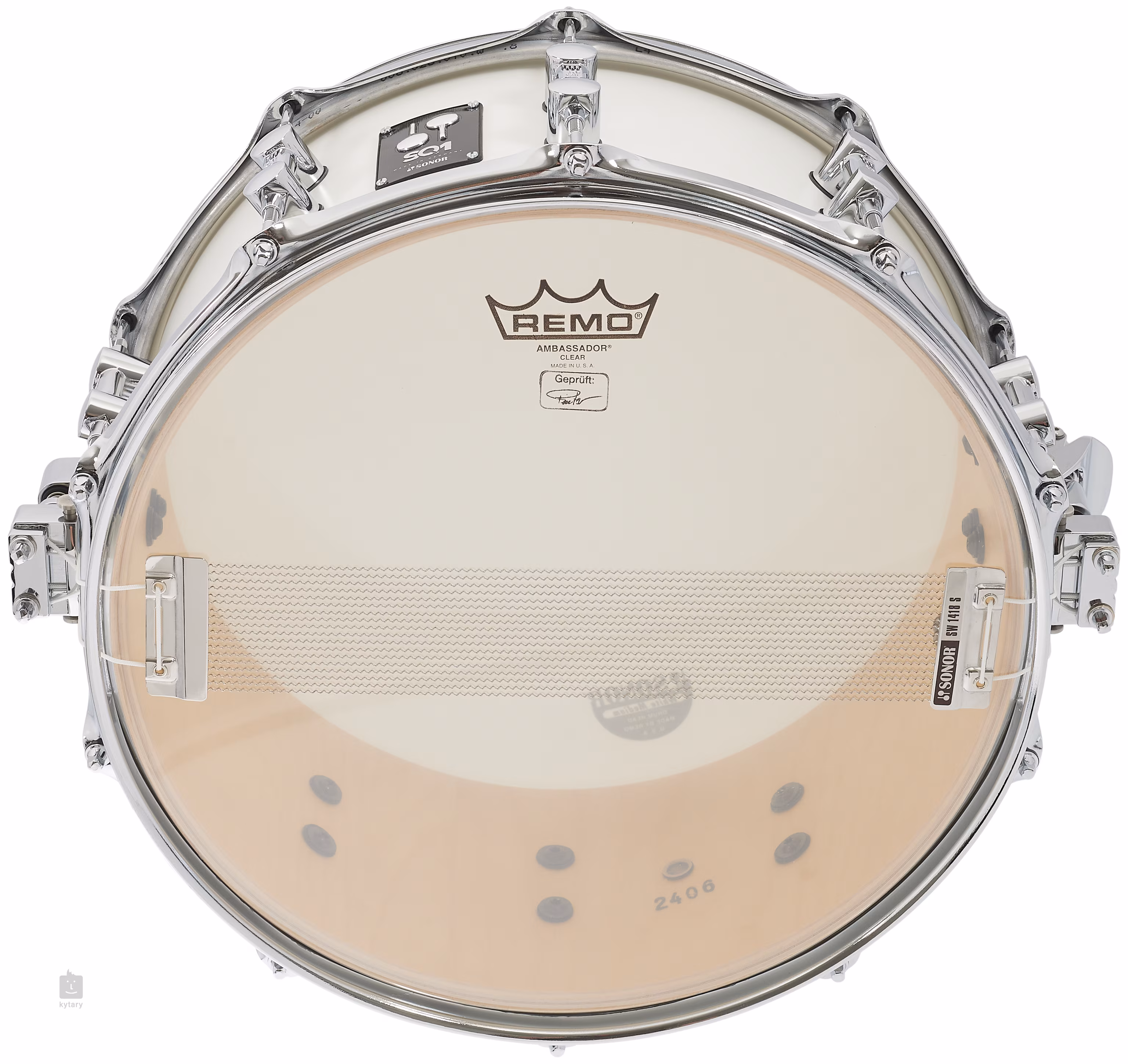 Le corps est en bouleau de poids moyen, 7 couches d'une épaisseur de 7 mm. Les bords d'appui sont à 45° et les jantes sont des Power Hoops de 2,3 mm. Les vis d'accordage sont des SONOR Double Lugs avec un pas de 40mm et l'accastillage est chromé.