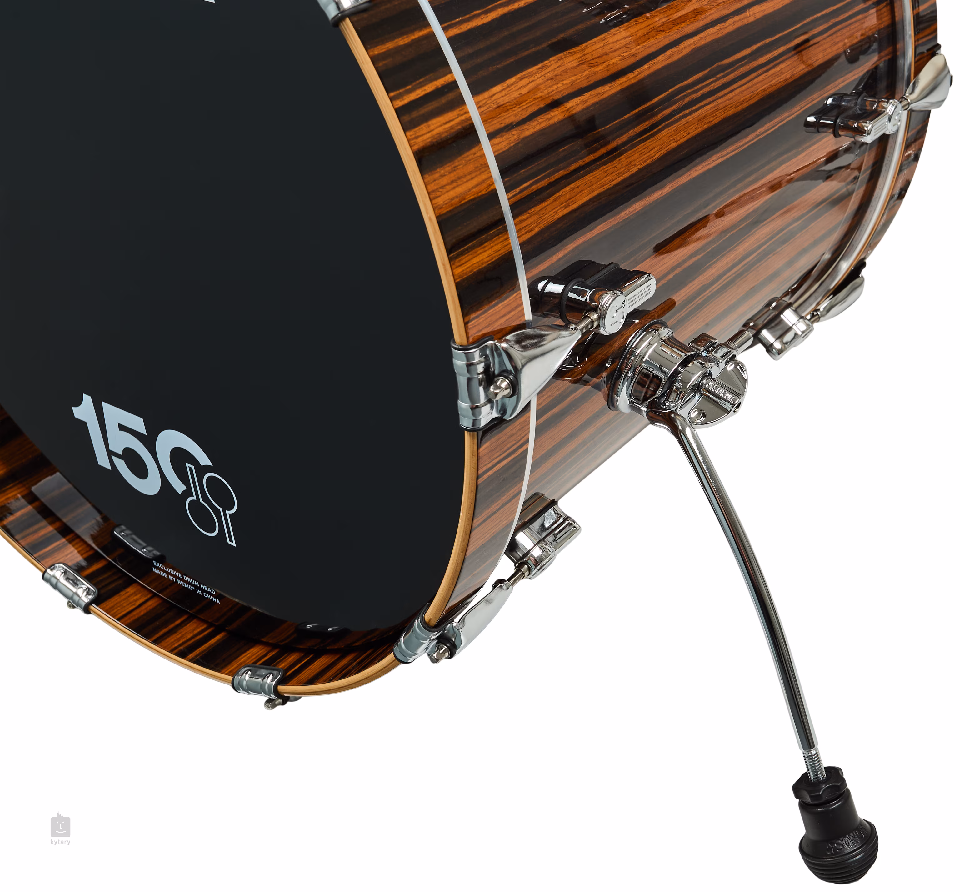 L'ensemble comprend également une caisse claire avec des composants AQ2 - des Power Hoops de 2,3 mm et une caisse claire standard, qui assurent un accord stable ainsi qu'un contrôle précis de la réponse. La membrane frontale de la grosse caisse, avec sa finition noire pré-amplifiée et son logo distinctif du 150e anniversaire, est également unique à l'ensemble.