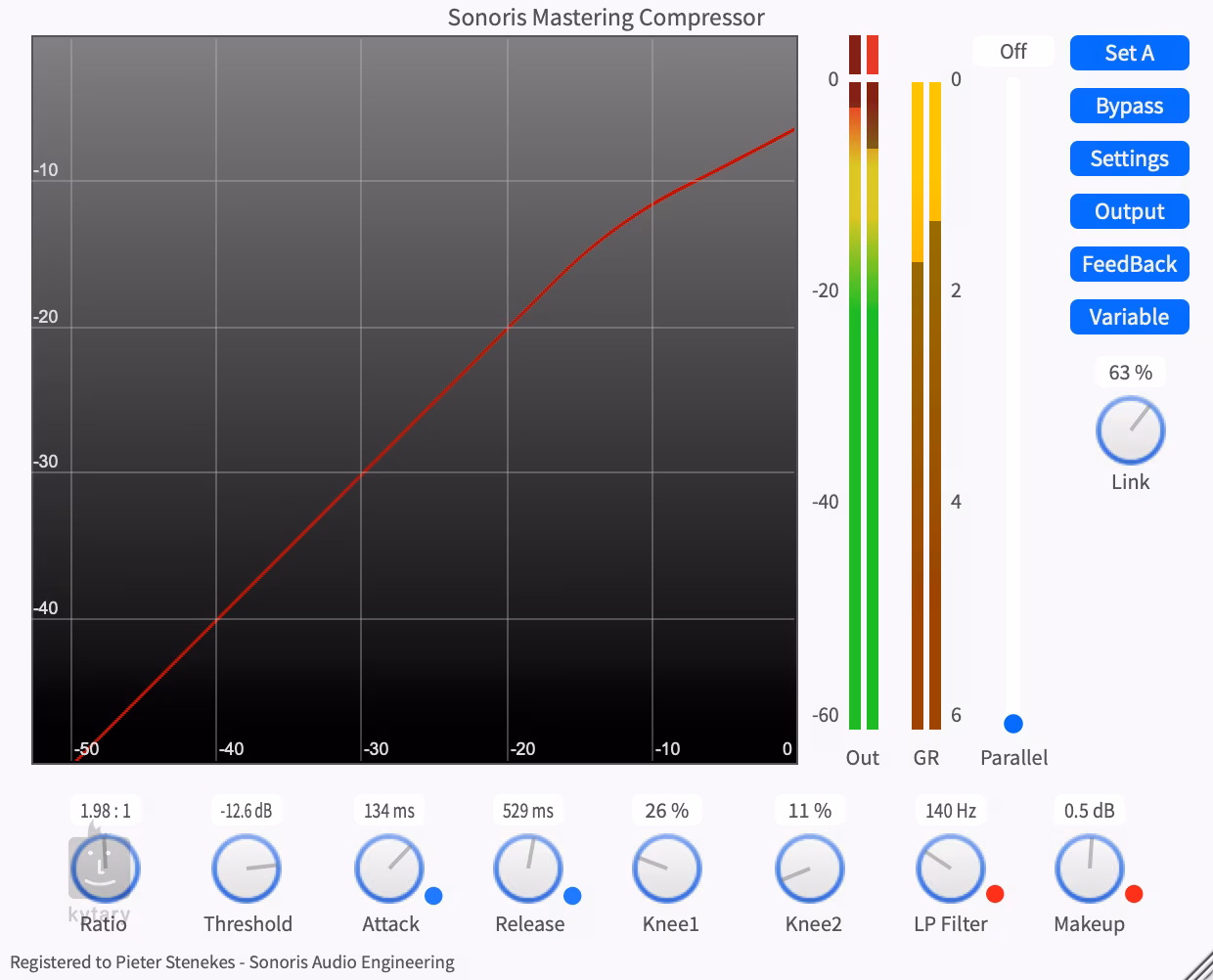 Caractère Si un comportement plus agressif est nécessaire, vous pouvez sélectionner la détection de larsen avec un genou dur. Ce dernier peut avoir un certain caractère lorsqu'il est poussé. Si nécessaire, le son peut être saturé avec des harmoniques égales en commutant les harmoniques.