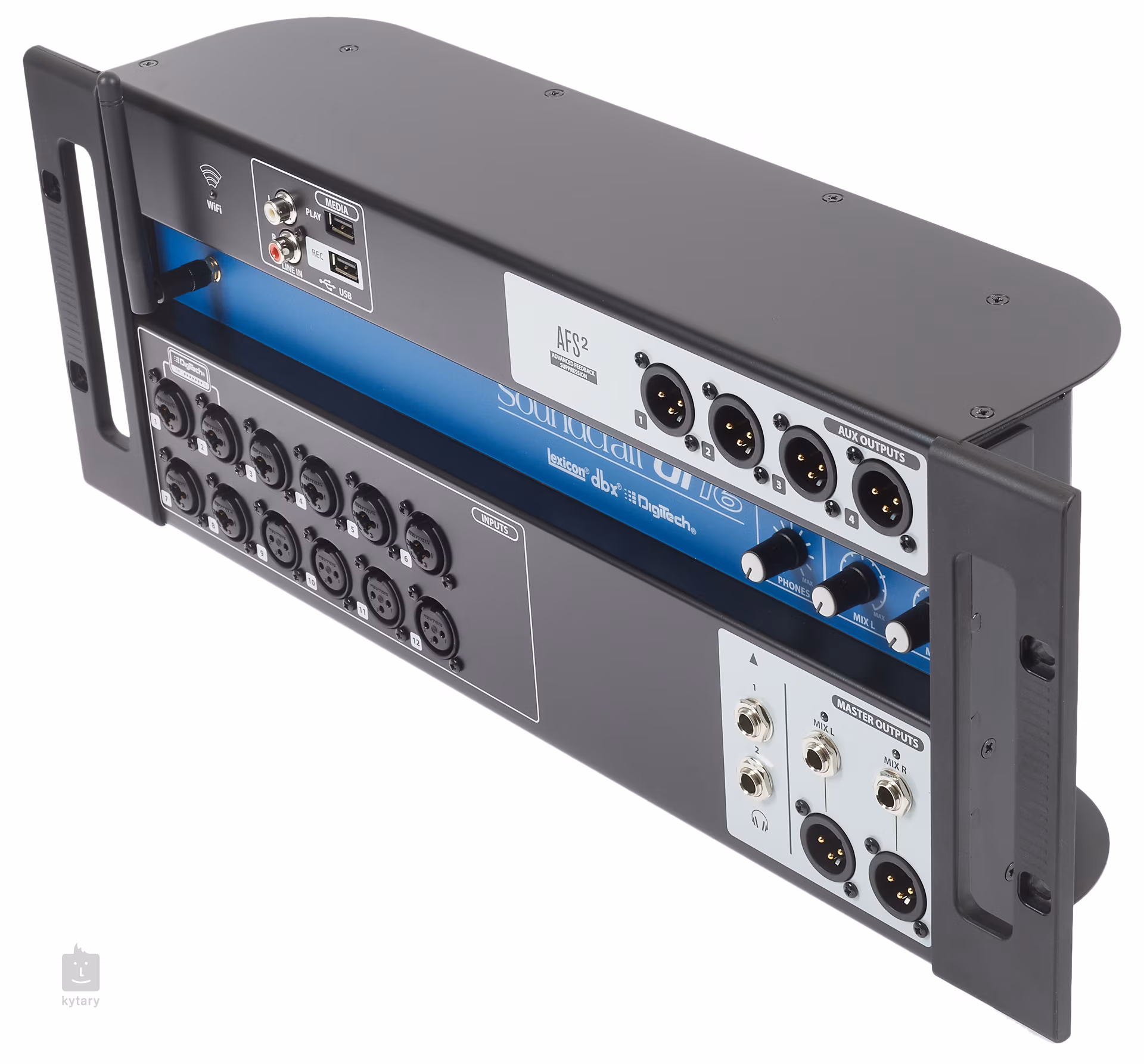 Le nombre total d'entrées est de 8x combinés XLR/Jack 6.3 mm, 4x XLR, 2x Hi-Z/Instrument et 1x RCA stéréo. Les sorties comprennent 4x Aux XLR, 2x casque (Jack 6,3 mm) avec contrôles de volume et une sortie stéréo principale XLR/Jack. L'USB à double canal pour la lecture (formats MP3, WAV, AIFF) et l'enregistrement direct se trouve sur le panneau avant, avec deux autres interfaces USB sur le côté, où l'on trouve également l'HDMI pour la connexion de l'écran.
