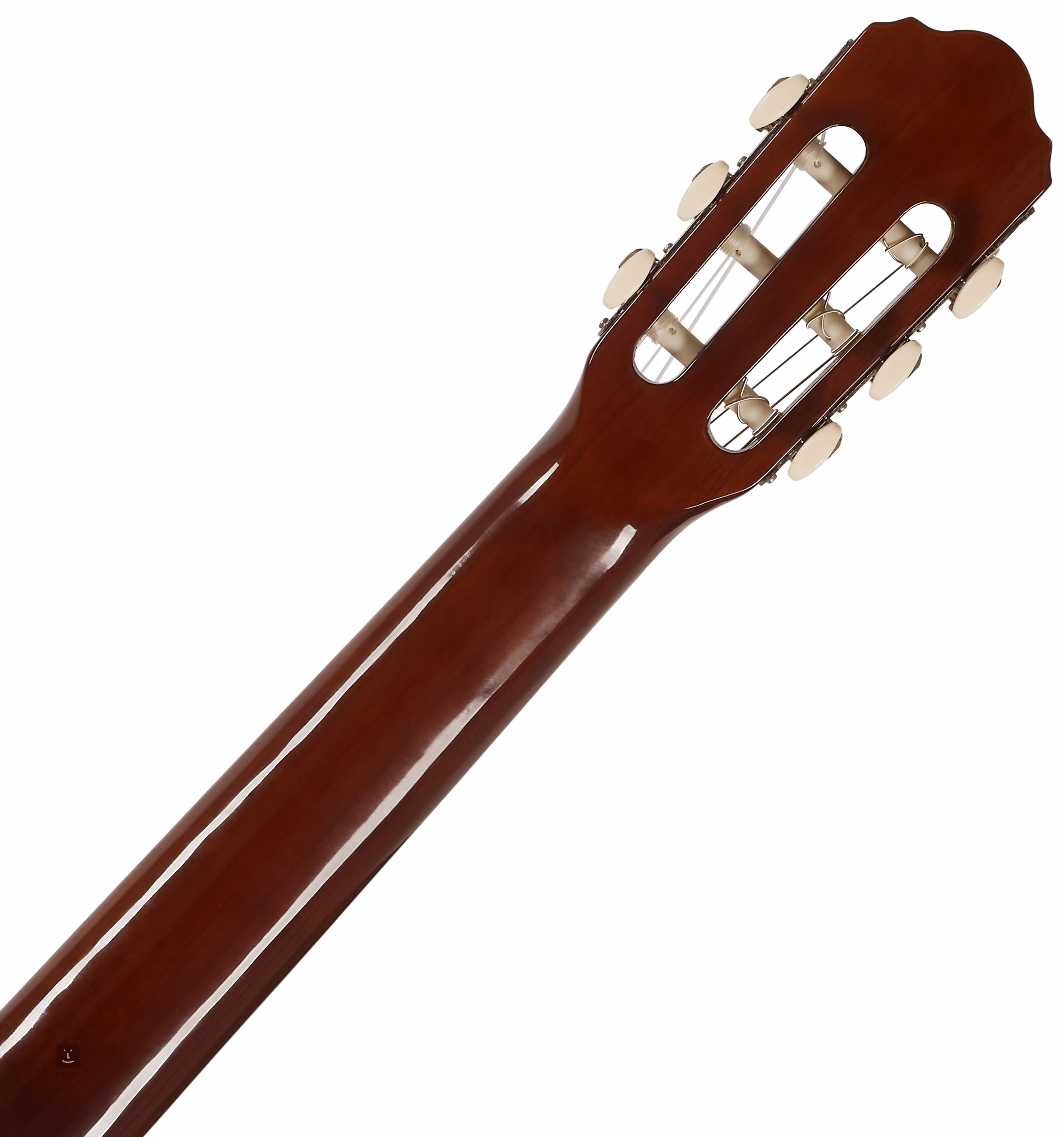 Les guitares classiques Marisol de Soundsation sont des instruments abordables conçus pour les musiciens débutants. La Marisol 44SB est une guitare classique 4/4 de taille normale avec un corps en tilleul stratifié fini en laque brillante, une touche en bois dur, des mécaniques standard et des touches traditionnelles telles que des filets et une rosace décorative. La guitare est livrée dans un sac de transport.