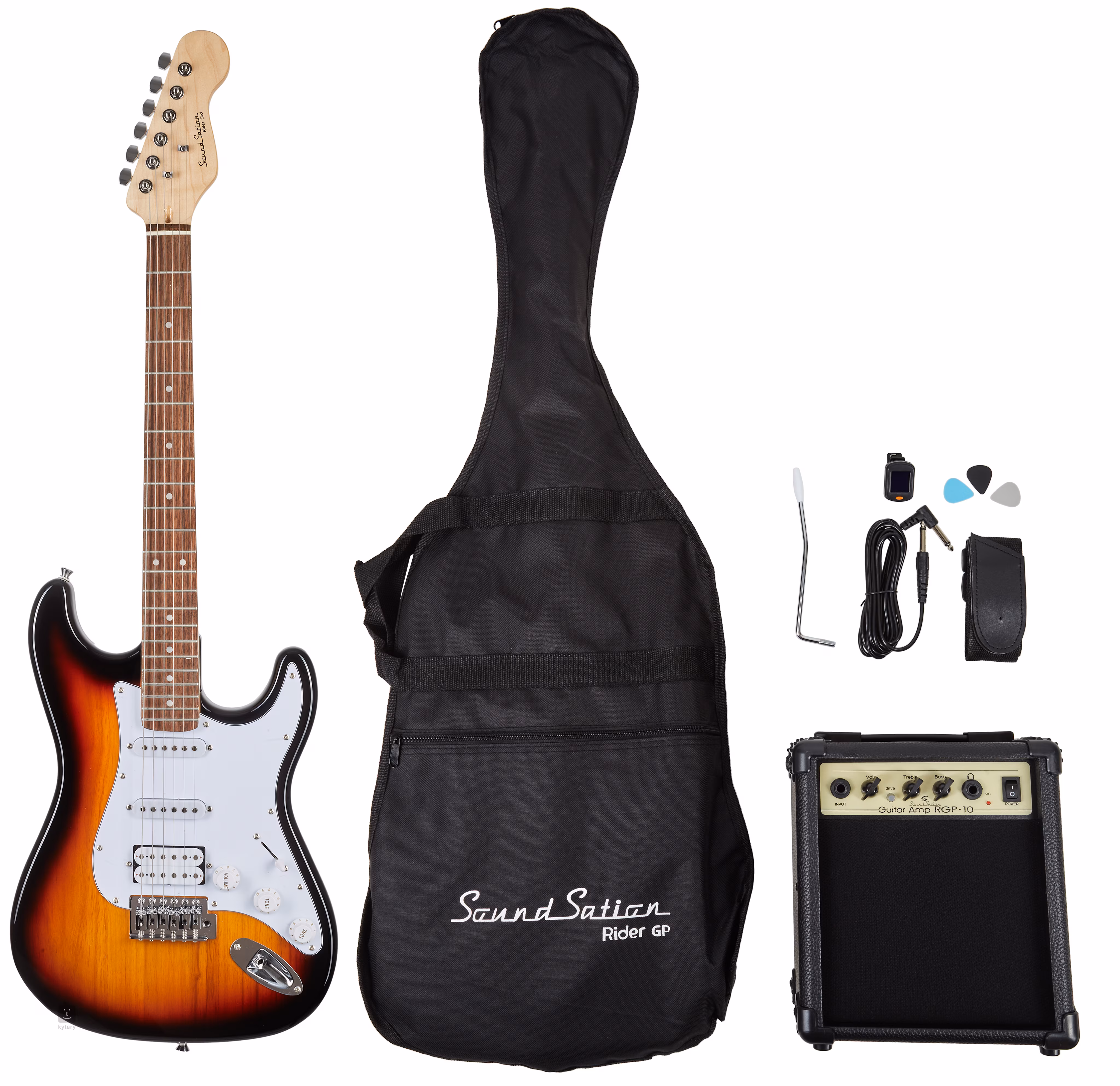 Le SOUNDSATION RIDER GP 3TS ELECTRIC GUITAR PACK contient tout ce dont vous avez besoin pour le musicien débutant. Plus précisément, une guitare électrique de style ST traditionnel équipée de trois bobines simples, un combo de guitare électrique RGB-10 d'une puissance de 10 watts avec sortie casque, un accordeur à pince, une sangle de guitare, un câble d'instrument, des médiators et une housse de transport.