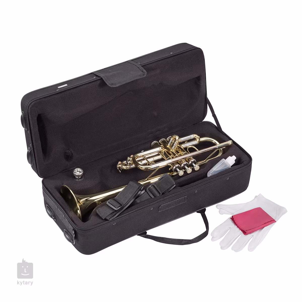 La trompette en do Soundsation STPGD-10C offre un son facile, une bonne intonation et un son clair. L'instrument est fabriqué en laiton avec une finition en laque d'or et comporte un mécanisme a piston en acier inoxydable, des accordeurs principaux, premier et troisieme réglables et deux valves a eau.
