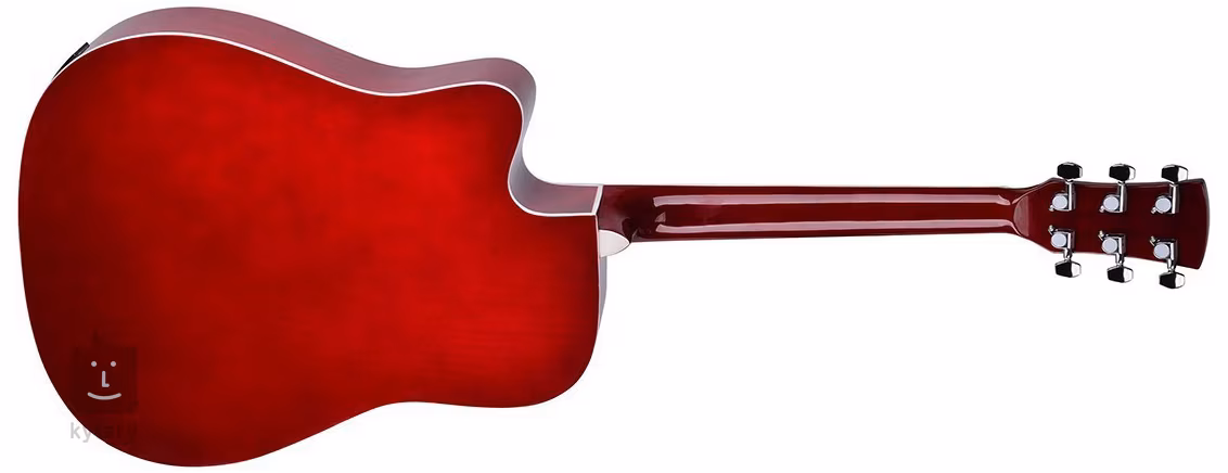 La table d'harmonie de la guitare électroacoustique YELLOWSTONE-DNCE-RDS est en épicéa contreplaqué, tandis que le dos et les éclisses sont en tilleul contreplaqué. La touche en bois noir est équipée de vingt frettes, l'orientation sur la touche est facilitée par des points de positionnement. Les cordes sont maintenues par des mécaniques chromées moulées sous pression et une touche en bois noir. Le style est accentué par les bordures du corps, du manche et de la touche, la finition rouge et la plaque de protection noire.