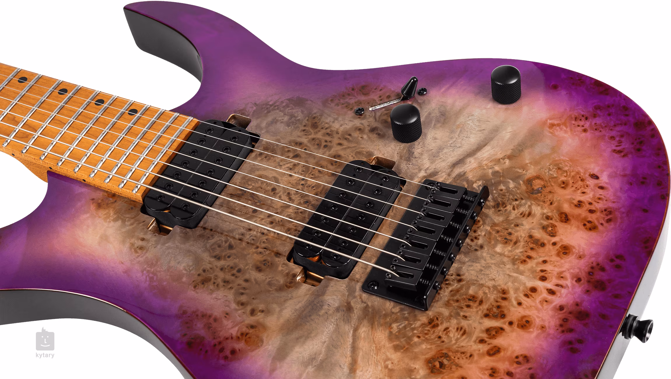 La Spira Guitars S-457 TPP est une guitare électrique à sept cordes abordable au design moderne Super ST, destinée aux musiciens de styles musicaux contemporains qui travaillent avec des accordages inférieurs - du rock et du métal modernes au metalcore, au djent et à d'autres sous-genres. Le corps de la guitare présente un placage de table en érable flammé et une finition Transparent Purple. Le manche en érable canadien au profil "Modern D" est collé à une touche en érable munie de 24 frettes géantes. Le traitement thermique du corps, du manche et de la touche rend le bois plus stable.
