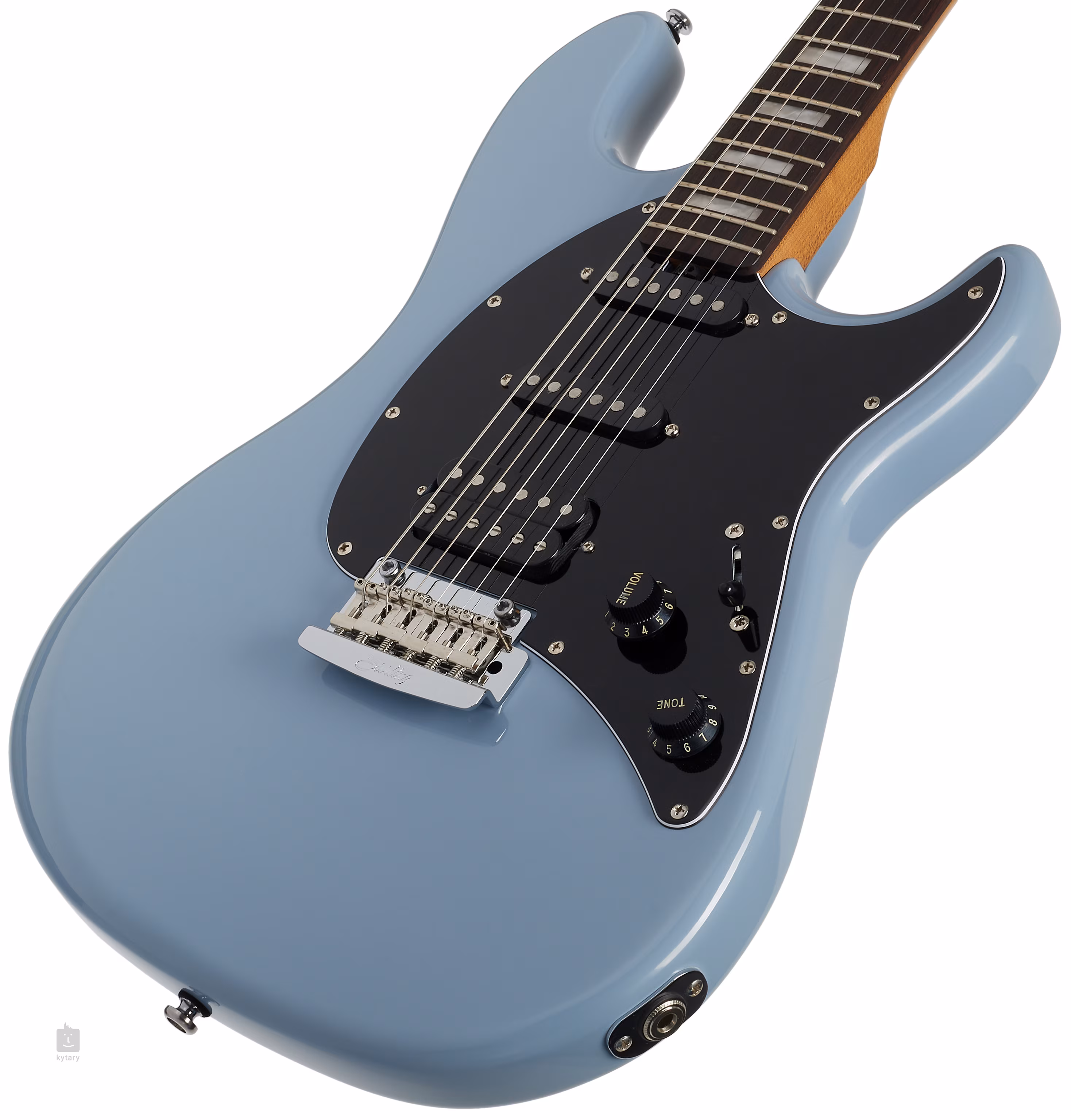C'est exactement le cas de la Cutlass CT50HSS Plus Aqua Grey, au design moderne ST/Double Cut. Le corps de la guitare est en peuplier. Un manche en érable grillé est collé à une touche en palissandre avec vingt-deux frettes de taille moyenne. Grâce au traitement thermique, le manche est plus stable, tout en acquérant une agréable couleur dorée. L'orientation sur la touche est facilitée par des blocs de positionnement en imitation de nacre.