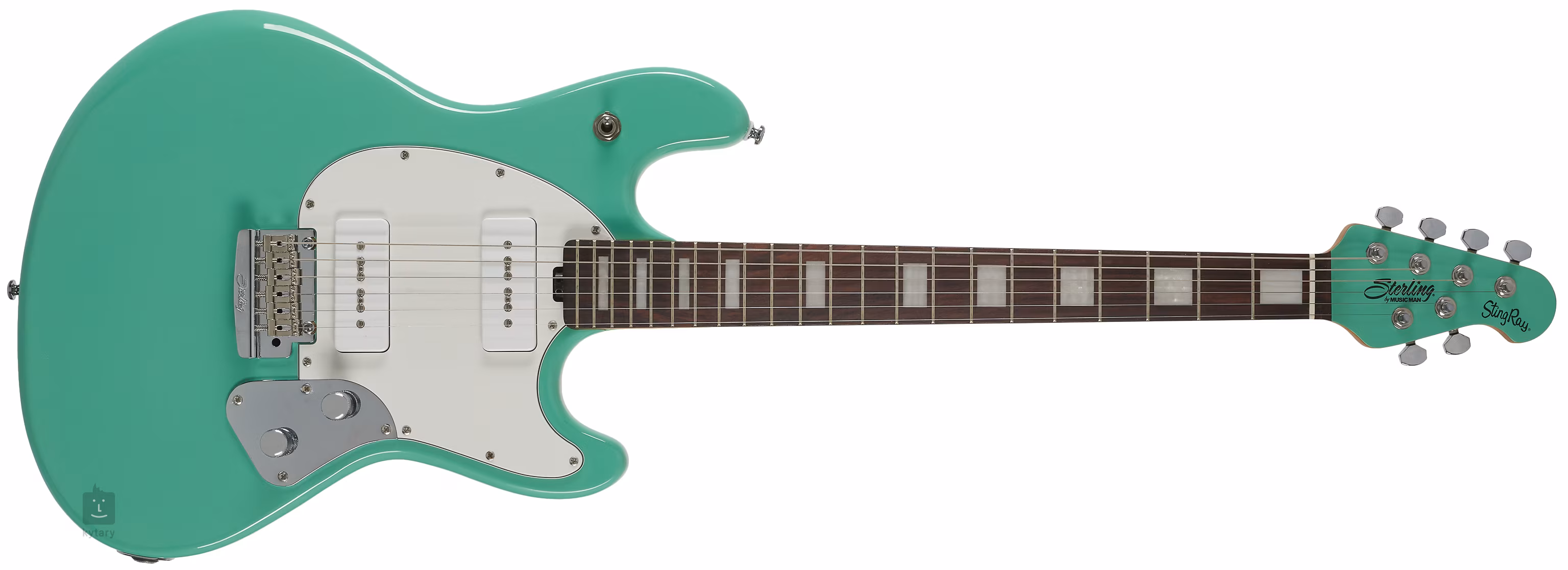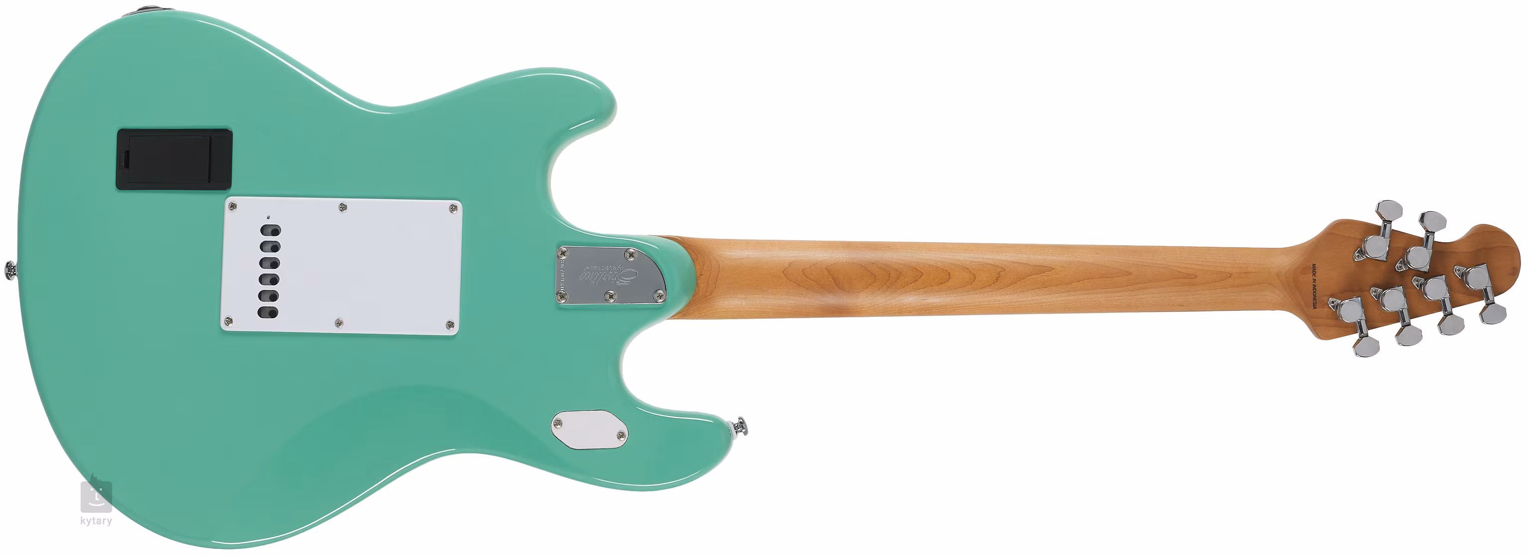 C'est exactement le cas de la StingRay Plus ST-SR50X Sea Foam Green à double coupe, basée sur les modèles de guitares Music Man des années 1970. Le corps de la guitare est en peuplier. Une touche en palissandre avec vingt-deux frettes est collée sur un manche en érable grillé boulonné. Des blocs de positionnement facilitent l'orientation sur la touche.
