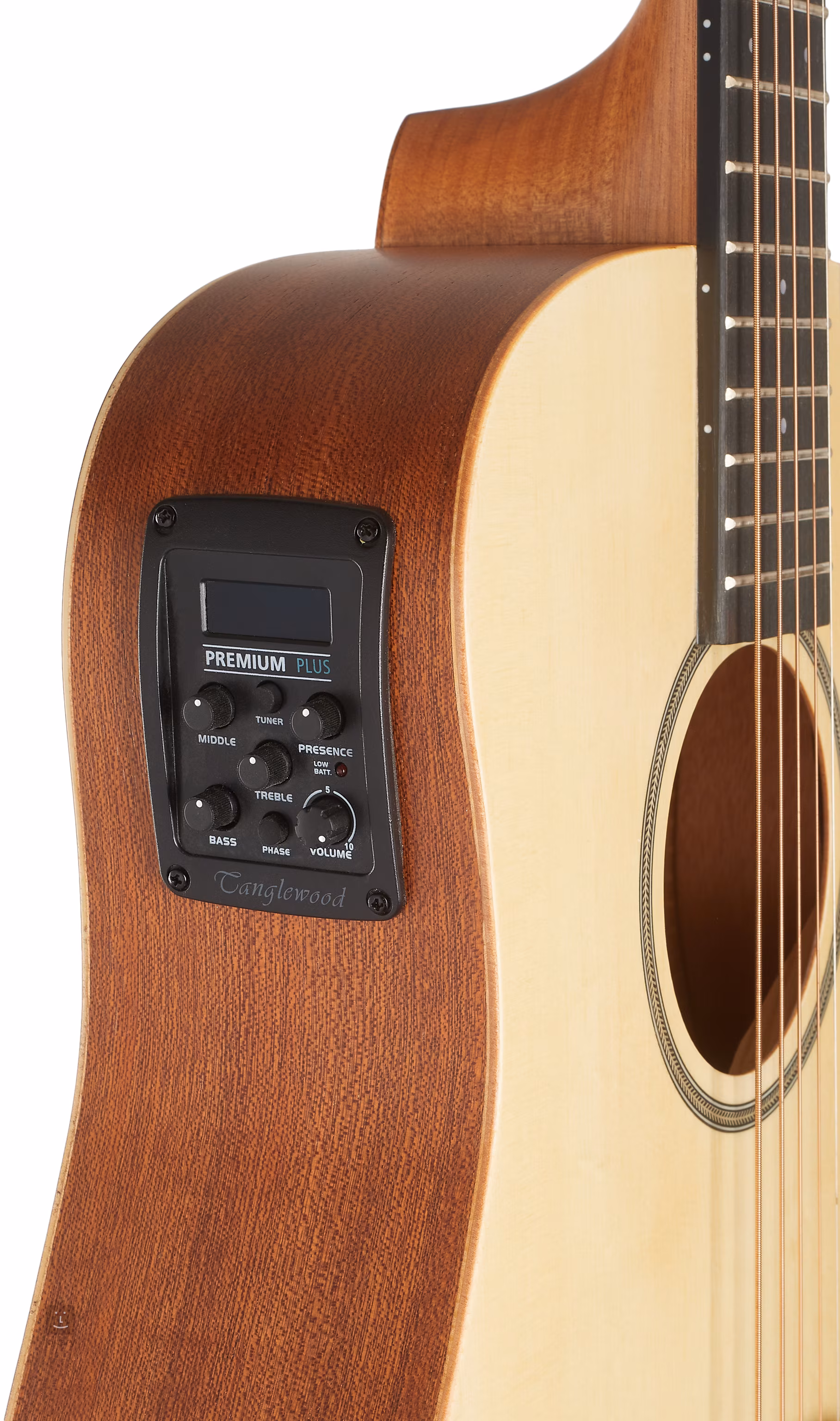Un préamplificateur Tanglewood TEQ-TGT avec accordeur intégré assure la sonorisation. La guitare est livrée dans un sac de transport.
