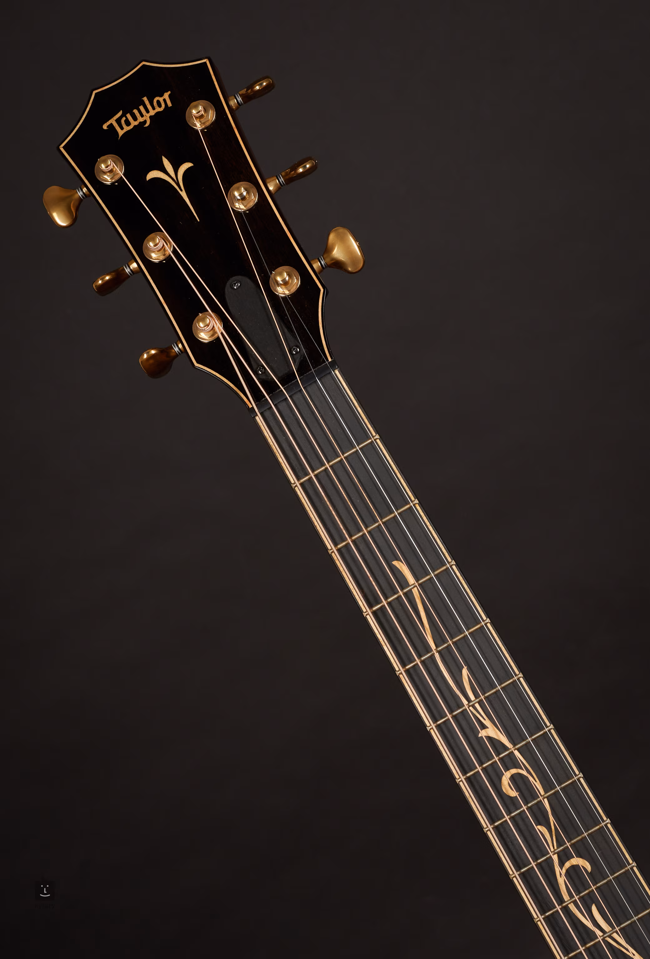Les cordes sont montées sur une touche en ébène avec des chevilles en ébène et des mécaniques Gotoh de haute qualité avec un rapport de 21:1. L'aspect impressionnant de l'instrument est accentué par un certain nombre d'éléments décoratifs tels qu'une rosace en érable et une bordure de caisse, des ferrures dorées ou un placage en palissandre sur la tête de la guitare, orné d'un logo Taylor en nacre. La guitare est équipée d'un système électronique de haute qualité. Le Taylor Expression System 2 utilise trois micros piézo indépendants spécialement conçus, situés derrière la touche. Contrairement aux micros conventionnels, ils ne détectent pas les mouvements de haut en bas de la table, mais les vibrations naturelles de la touche. Le son est ainsi beaucoup plus naturel, coloré et agréable, et il réagit mieux à la dynamique de votre jeu. En même temps, le nouveau préamplificateur renforce le signal de 25 %. Bien entendu, l'effet Larsen est éliminé et vous pouvez régler le volume, les basses et les aigus.