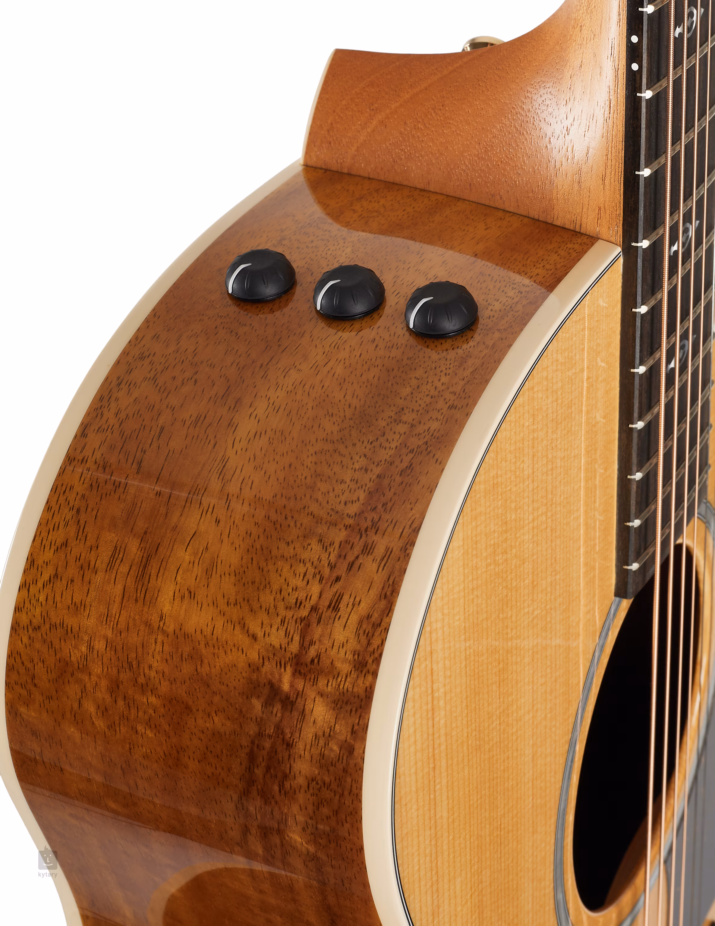 Le manche en acajou est collé à une touche en ébène dotée de vingt frettes. Un subtil pan coupé arrondi dans la partie inférieure de la caisse (Venetian Cutaway) facilite le toucher aux positions supérieures de la touche. La stabilité de l'accordage est garantie par la fixation des cordes NuBone au niveau de la frette zéro de la tête en ébène et par les mécaniques moulées sous pression de Taylor en finition dorée. Le look élégant de l'instrument est accentué par des éléments traditionnels tels qu'un pickguard imitation écaille de tortue, une bordure de corps de couleur crème, une rosace imitation nacre et des repères de position.