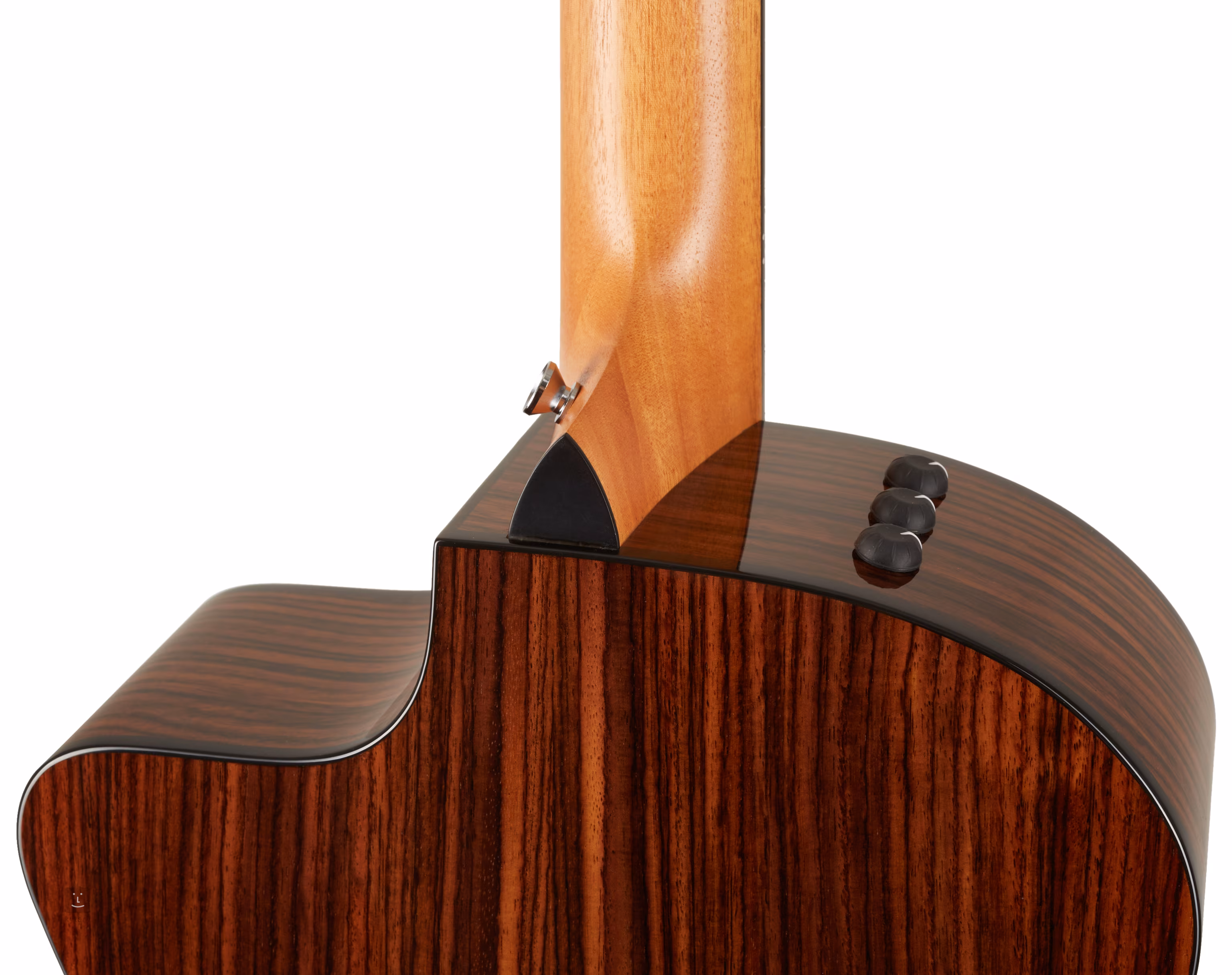 La stabilité de l'accordage est garantie par la fixation des cordes NuBone zero fret dans la tete en ébene et les engrenages Taylor en nickel avec un rapport d'engrenage de 18:1. L'allure élégante de l'instrument est ponctuée d'éléments traditionnels sous la forme d'un pickguard en imitation écaille de tortue, d'une bordure de corps noire, d'une rosette composée d'anneaux noirs et blancs et d'un placage d'ébene sur la tete de lecture orné du logo Taylor.