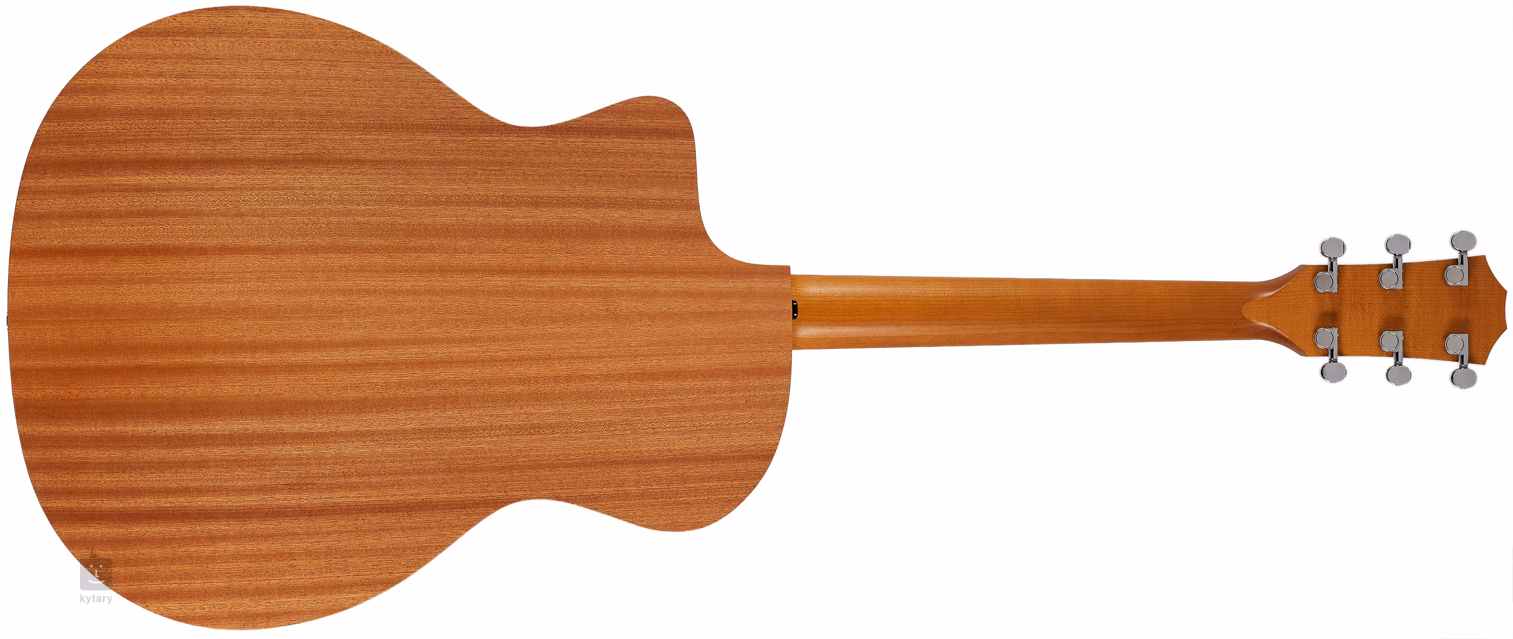 Le manche étroit en érable sans pied est collé à une touche en ébène dotée de vingt frettes. La découpe inférieure du corps facilite le jeu, même dans les positions les plus élevées de la touche. Les cordes sont montées dans les mécaniques chromées moulées sous pression et la touche en ébène. La finition élégante est accentuée par une rosace noire et un pickguard en imitation écaille de tortue.