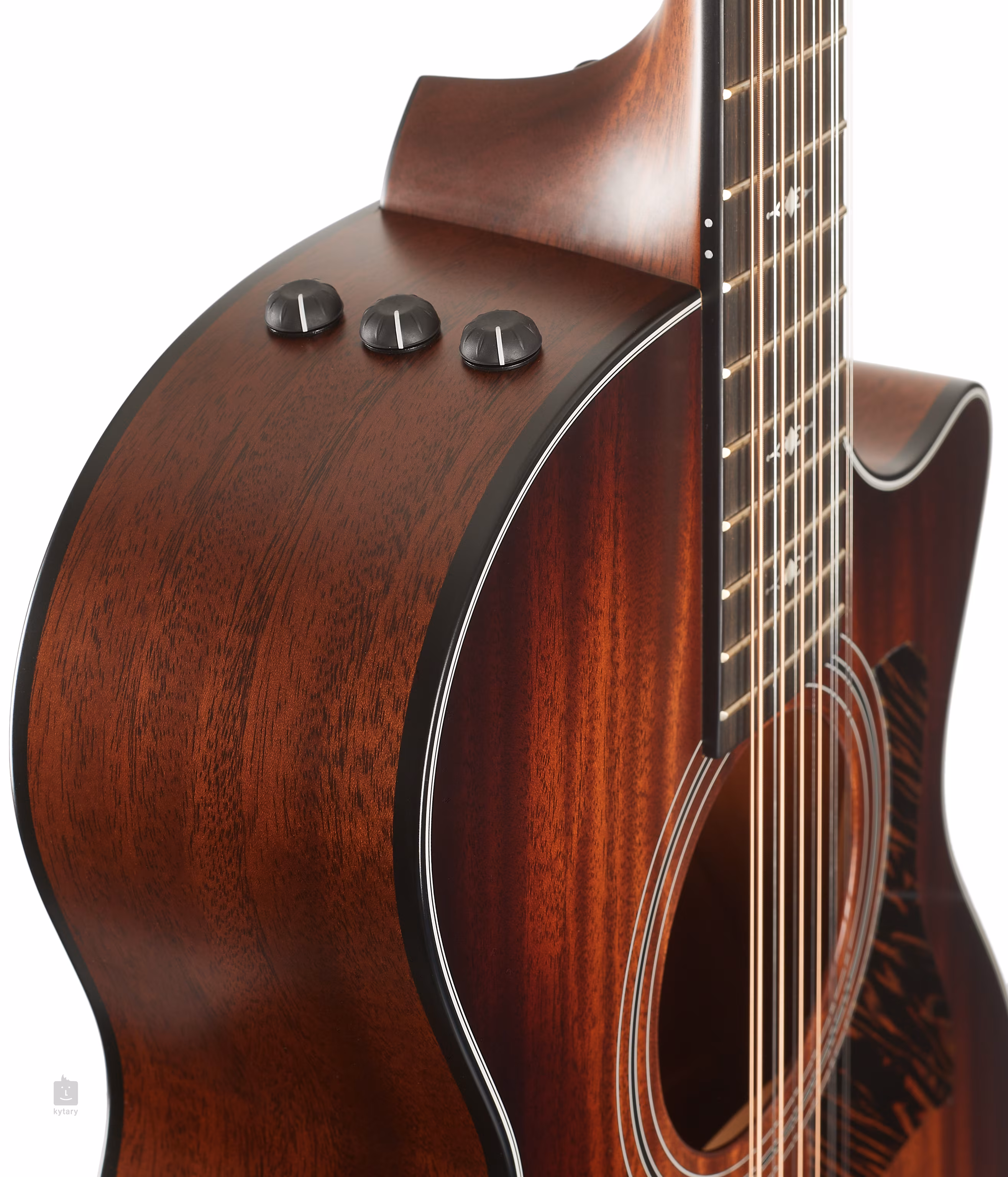 Le manche en acajou est collé à une touche en ébène d'Afrique de l'Ouest ornée de repères de position décoratifs. Une découpe arrondie de la partie inférieure du corps (vénitienne) facilite le jeu aux positions supérieures de la touche. Le look impressionnant de l'instrument est accentué par la finition Shaded Edge Burst de la table d'harmonie, les mécaniques Taylor noires, les bordures de corps noires, le placage d'ébène de la tête orné du logo de l'entreprise en imitation nacre et le protège-moteur Firestripe.