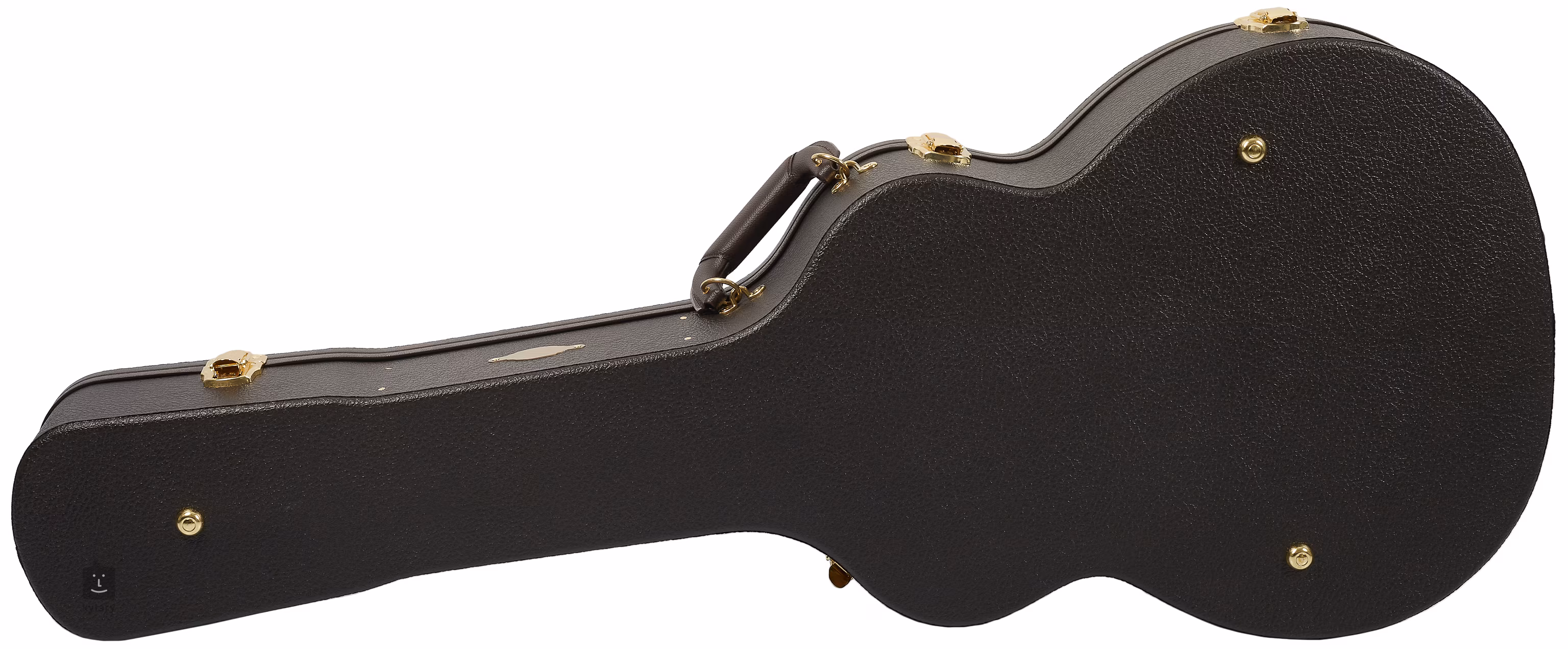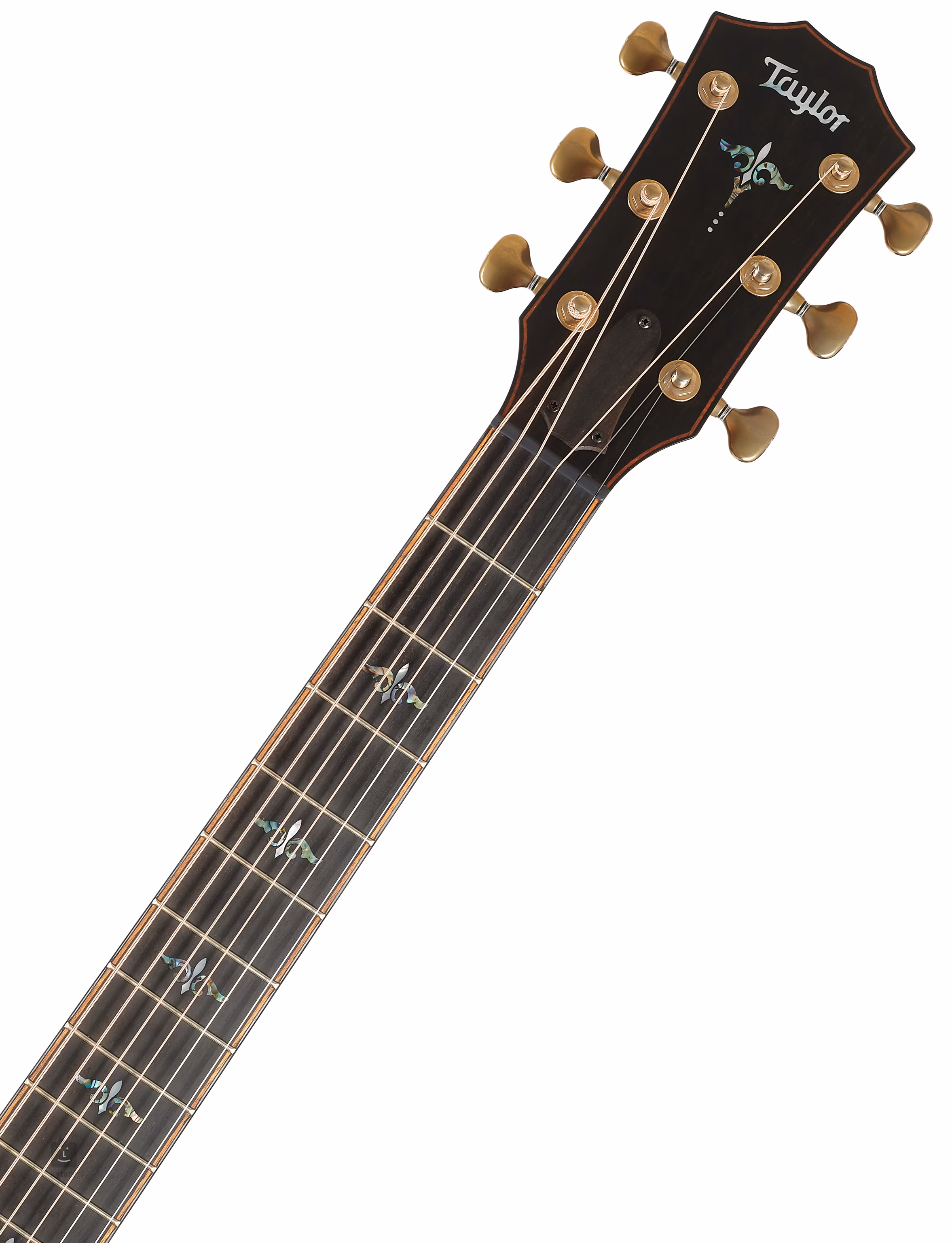La finition luxueuse est accentuée par l'éclat satiné subtil du corps et la couleur Wild Honey Burst de la table, l'impressionnante finition Kona Edgeburst du dos et des éclisses, l'épaulement profilé, les bords arrondis du corps et de la touche, et les incrustations de nacre sur la touche et la tête (Paua, Mother-of-Pearl), rosace en nacre (Paua) avec incrustation en koa hawaïen, incrustation périphérique en koa hawaïen sur la touche et la tête, lignes noires et incrustations en koa sur la table d'harmonie et la table arrière, bordure de la table d'harmonie en ébène, accastillage en or antique et placage en ébène sur la tête, orné d'un logo Taylor en nacre (Mother of Pearl).