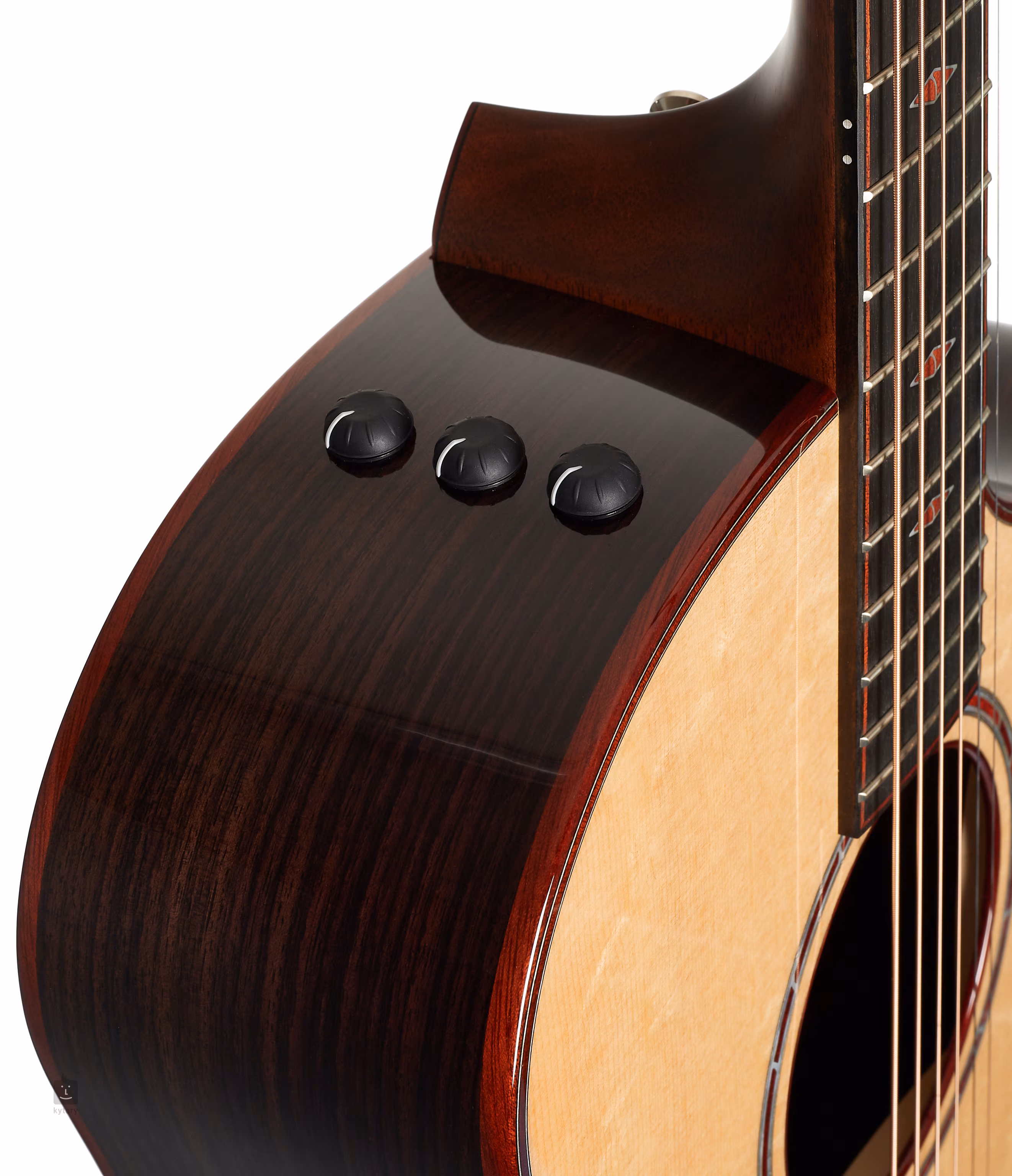 Le manche en acajou est collé à une touche en ébène de 20 frettes. L'orientation sur la touche est facilitée par des repères décoratifs en nacre et en bois de sang. La stabilité de l'accordage est assurée par la fixation des cordes via la frette zéro TusQ dans le mécanisme Gotoh 510 chromé et la touche en ébène. La finition luxueuse de la guitare est accentuée par la bordure et le corps en bois de sang, une rosace décorative composée de bois de sang et de nacre, des chevilles dans le manche avec des points rouges en opales australiennes et un logo en nacre sur la tête de la guitare.