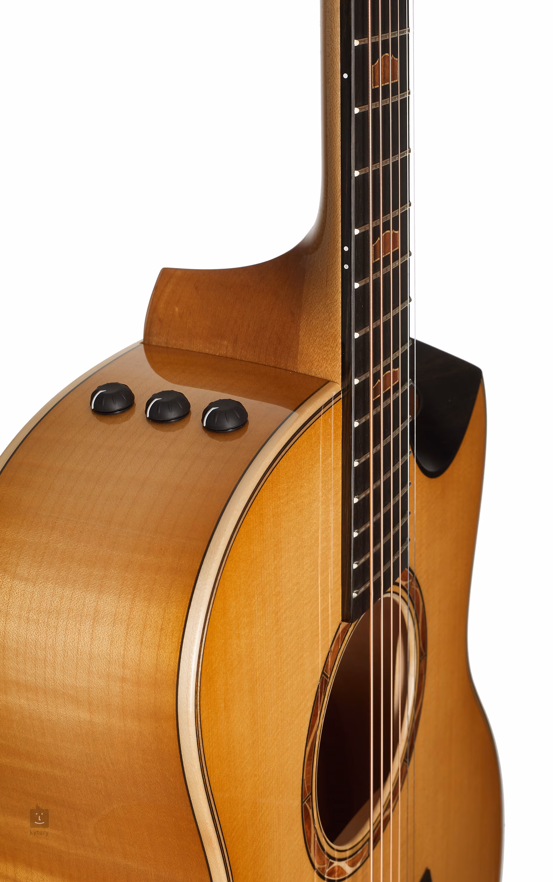 La table d'harmonie en épicéa de Sitka est dotée d'une finition laquée brillante et d'une finition Antique Blonde. Le dos et les éclisses sont en placage d'érable de qualité A. Le son de la guitare est rehaussé par les nervures brevetées V-Class, qui améliorent les performances de la guitare sur trois plans : augmentation du volume de l'instrument, prolongation du sustain et amélioration de l'intonation.