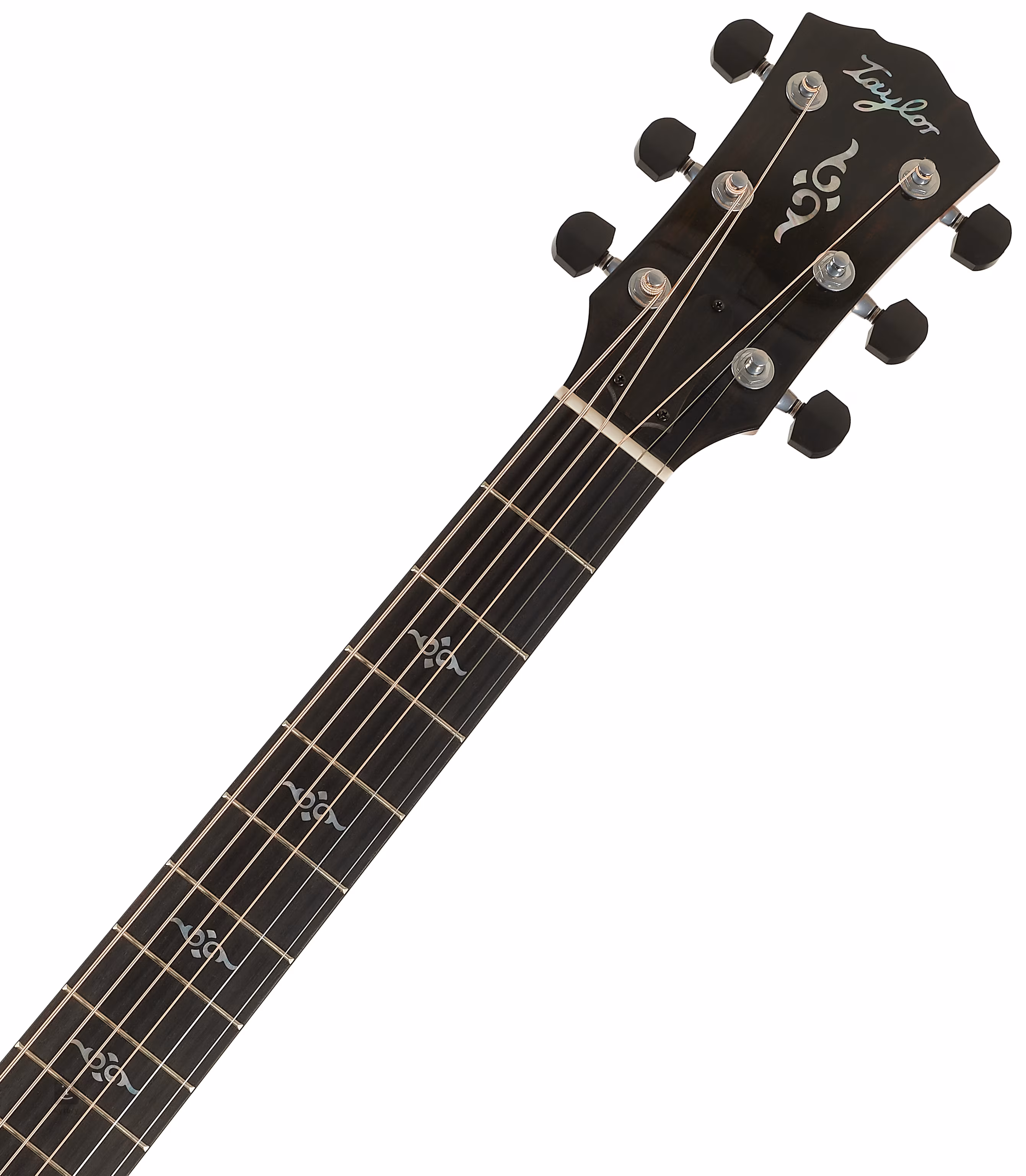 Le manche en acajou est collé à une touche en ébène dotée de vingt frettes. La stabilité de l'accordage est assurée par la fixation des cordes sur une touche en palissandre du Honduras et une mécanique haut de gamme Gotoh 510 Antique Chrome avec chevilles en ébène. L'artisanat luxueux est accentué par des éléments décoratifs tirés de modèles historiques de banjo et de mandoline, d'anciens modèles Taylor et des guitares à lubrifiant sur lesquelles Andy Powers, le guitariste principal de Taylor, travaillait avant de rejoindre l'entreprise. Plus précisément, les repères de position en nacre sur la touche et la tête (nacre "Continental"), le corps et le pourtour des trous de son en imitation ivoire, la table en palissandre du Honduras et les lignes noires, la rosace en nacre (Paua) surmontée d'anneaux en palissandre du Honduras, l'imitation ivoire et les lignes noires, et le protège-moteur en imitation écaille de tortue gravé du motif "Continental".