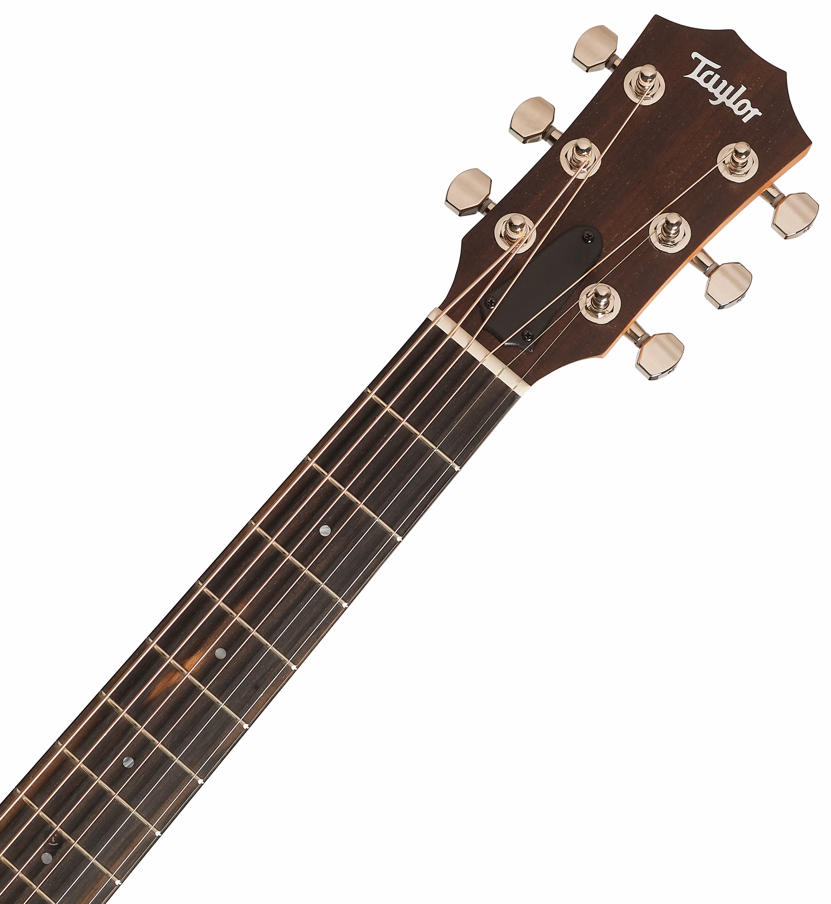 L'avant de la guitare est fabriqué en épicéa de Sitka massif, tandis que le dos et les éclisses sont en palissandre stratifié. Le manche en acajou est collé à une touche en ébène dotée de vingt frettes. La stabilité de l'accordage est garantie par la fixation des cordes dans la tête en ébène et les mécanismes Taylor en nickel.