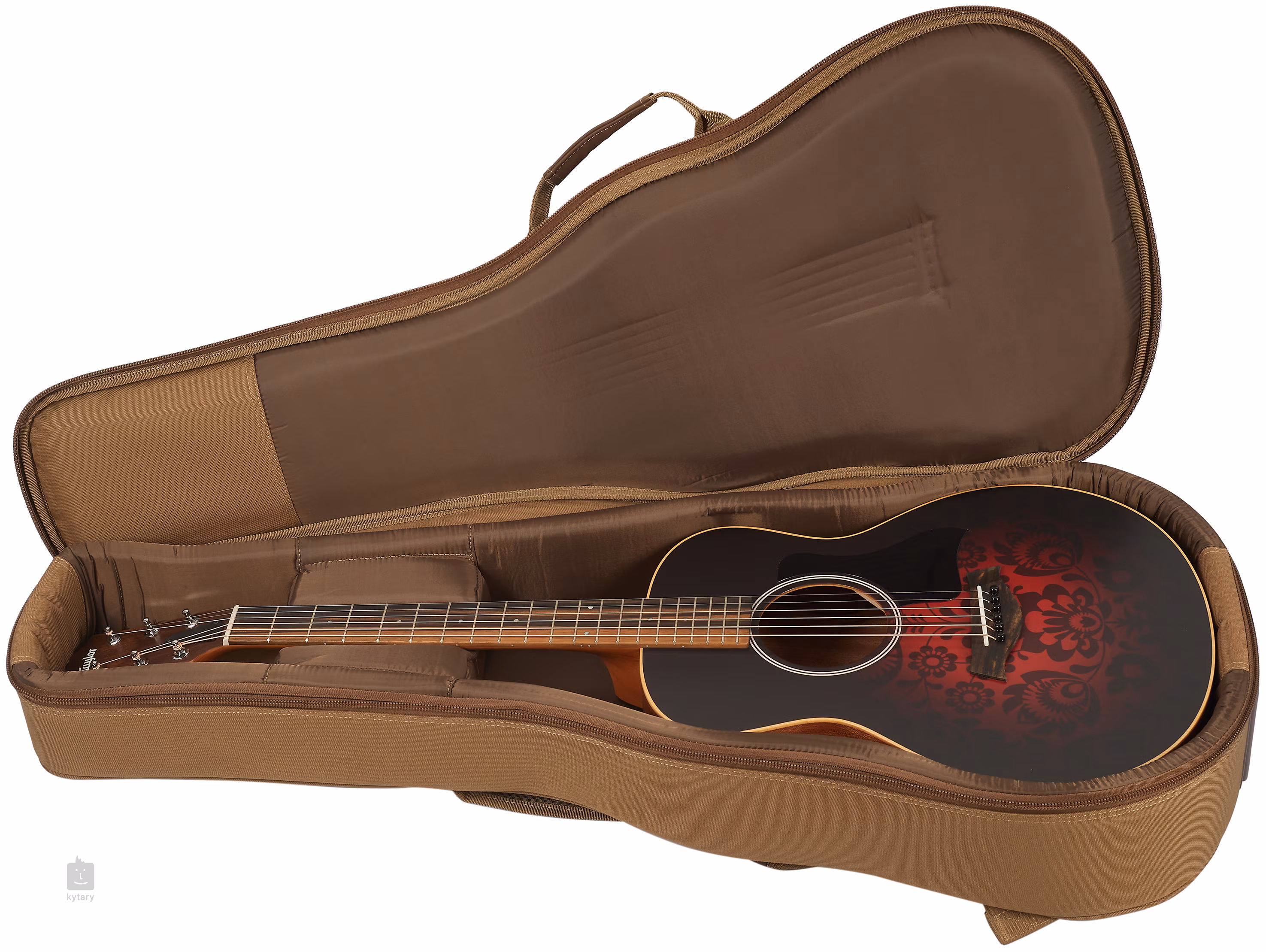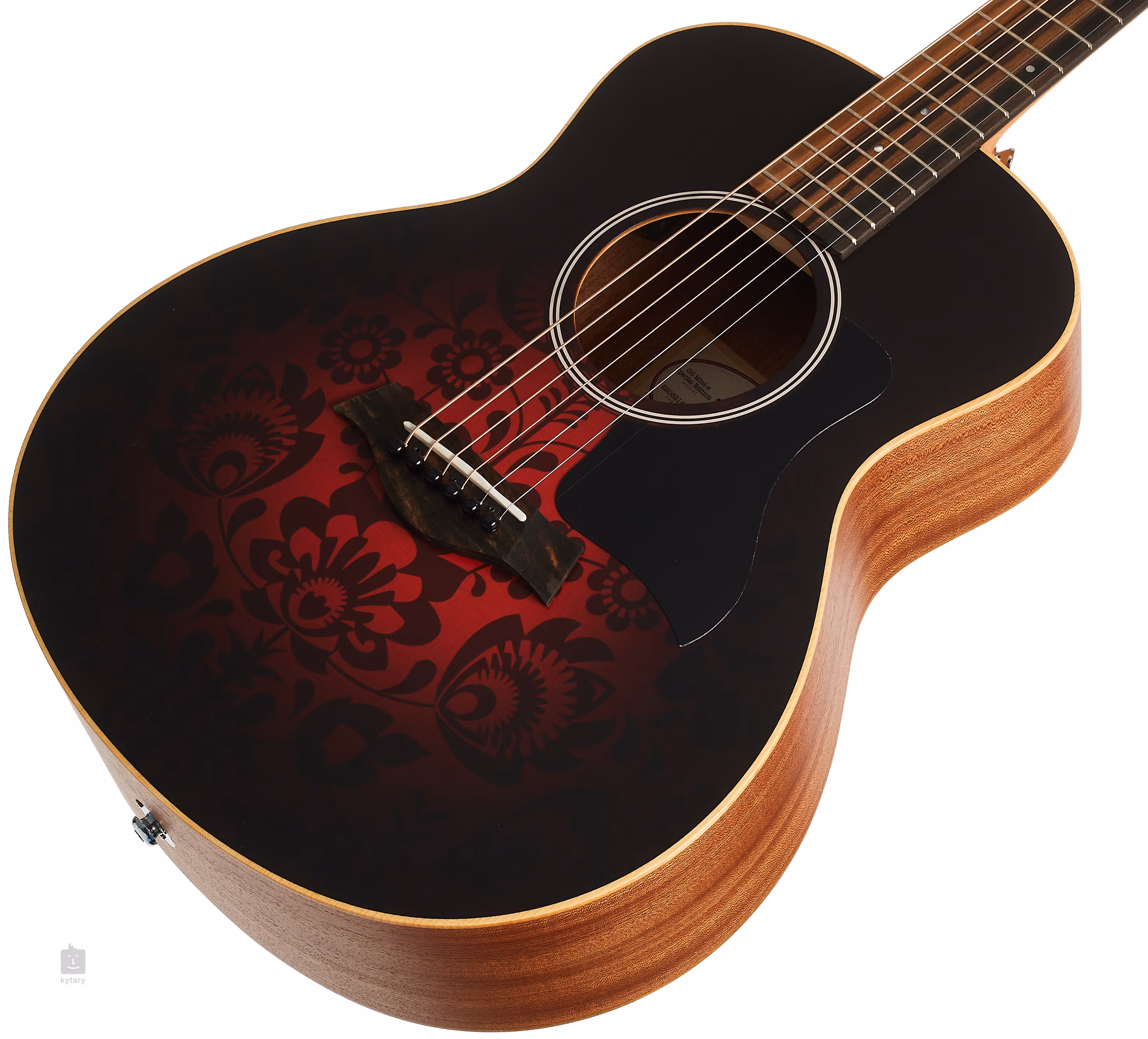 La stabilité de l'accordage est garantie par la fixation des cordes à travers la frette zéro NuBone dans le mécanisme Taylor moulé sous pression et à travers le sillet en micarta dans la tête en ébène. Le look élégant de l'instrument est accentué par la finition sunburst de la table d'harmonie et les motifs graphiques floraux en noir et rouge, le pickguard noir et le placage copafera de la tête décoré du logo Taylor imprimé.
