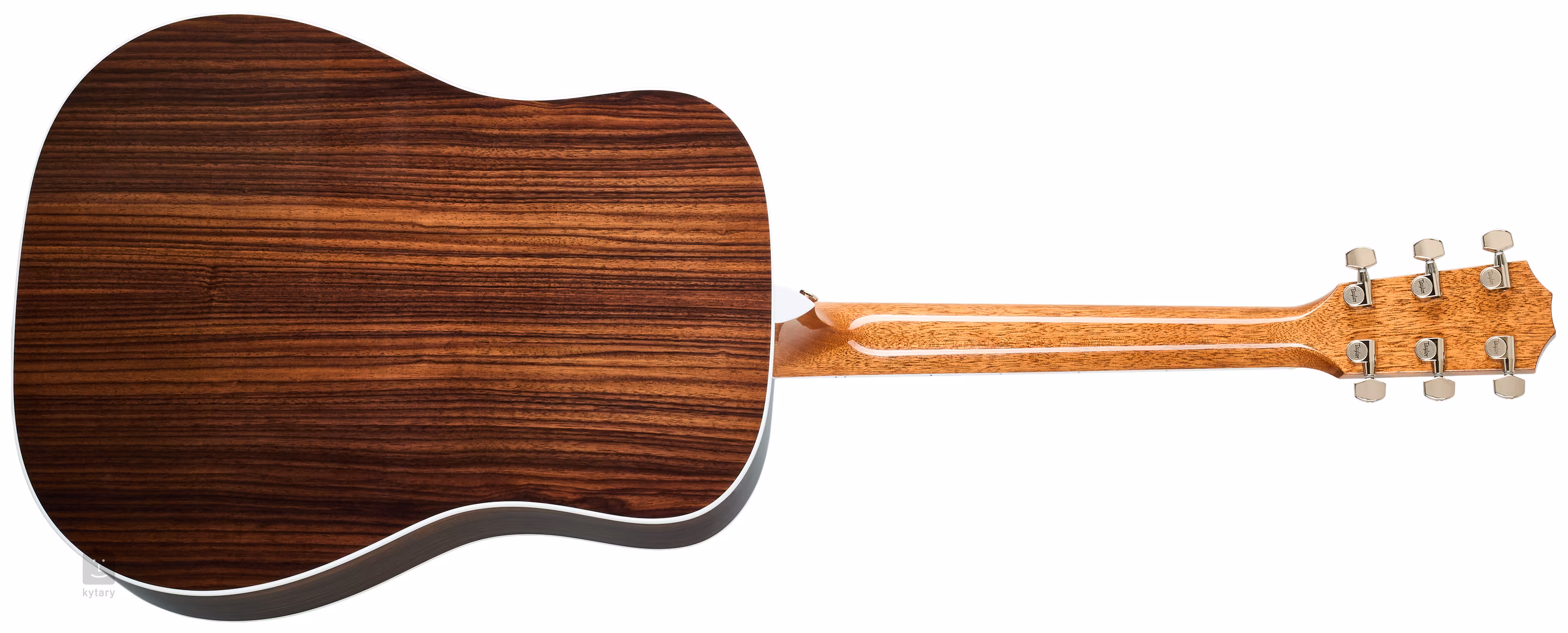 Les cordes sont maintenues par des mécaniques d'entreprise en nickel et une touche en ébène de forme Taylor moderne. La belle facture est accentuée par la bordure blanche, la rosace en ormeau vert, les chevilles en ébène sur la tête avec des points en nacre (ormeau) et le pickguard en imitation écaille de tortue.