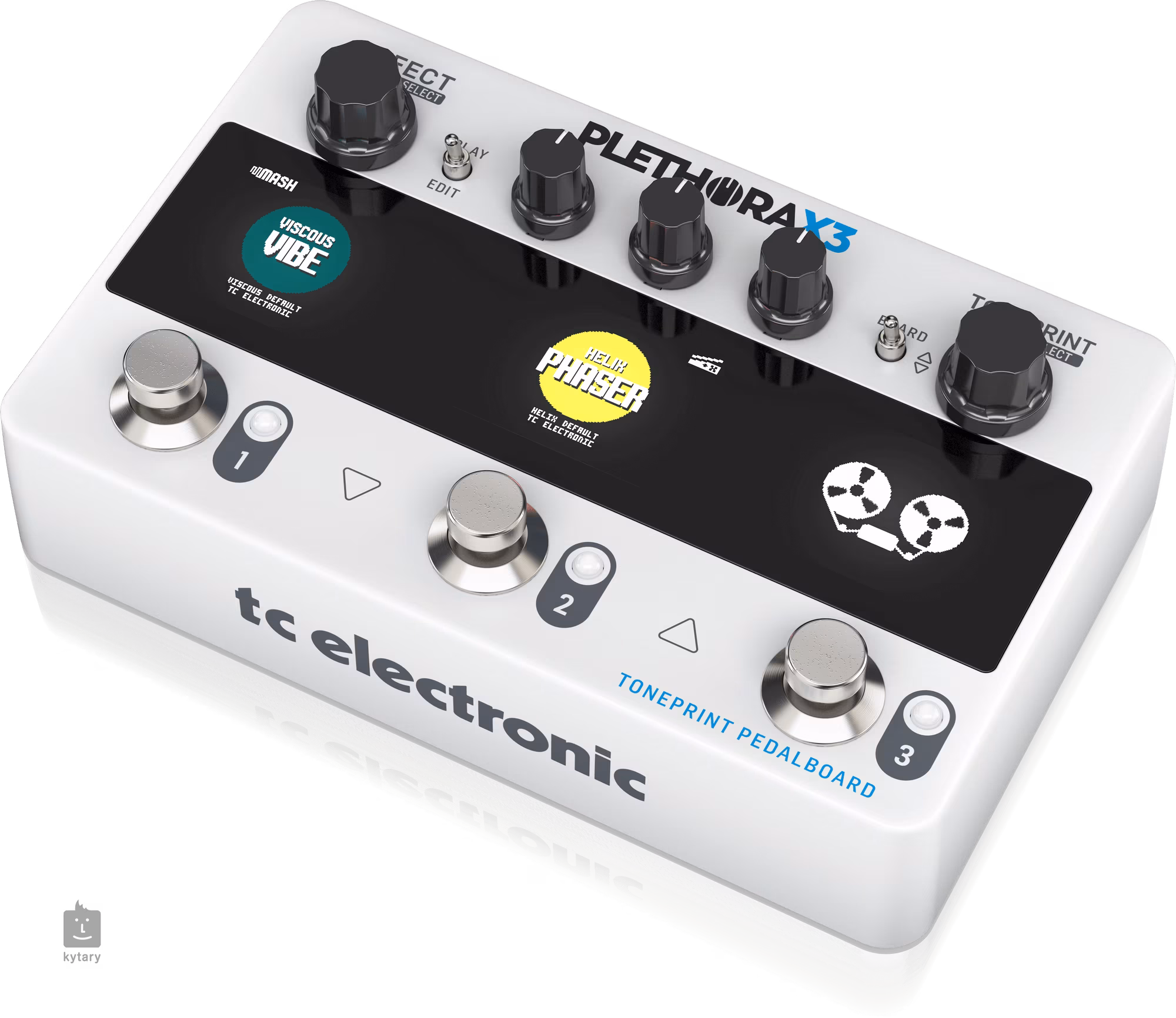 Le PLETHORA X3 est un multieffet guitare TC Electronic légèrement différent qui tire pleinement parti de la technologie numérique et offre une pléthore d'effets. Dans l'application TonePrint (téléchargeable gratuitement), il suffit de choisir parmi une vaste base de données d'effets de guitare et de les charger dans le multieffet via Bluetooth ou un câble USB. Vous pouvez ainsi modifier les effets à l'infini et créer de nouveaux pédaliers avec une multitude de combinaisons sonores. Les paramètres individuels peuvent ensuite être édités à l'aide des commandes sur le boîtier ou via l'application TonePrint, qui offre des options d'édition étendues - vous pouvez éditer des centaines de paramètres pour transformer le son de votre pédalier au-delà de la reconnaissance, ou plonger dans la création de sons entièrement nouveaux et créer vos propres effets TonePrint.