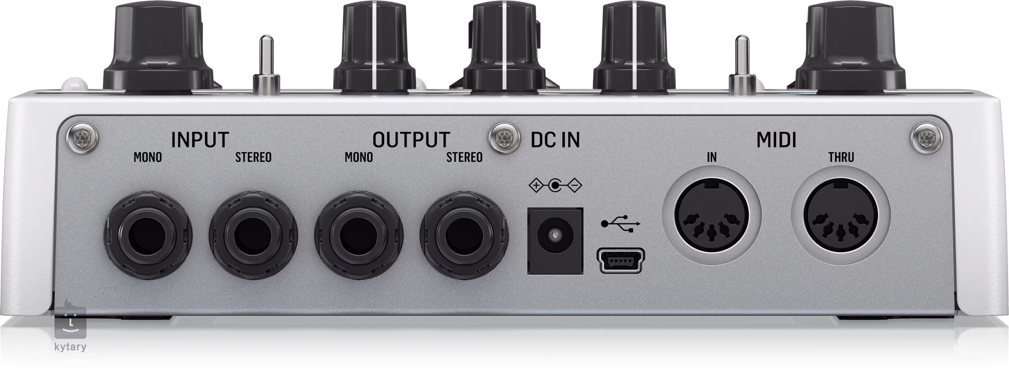Sur le panneau arrière, outre les entrées et sorties stéréo standard, vous trouverez également des entrées et sorties MIDI IN et THRU pour contrôler les multieffets avec un appareil externe et une interface USB pour la mise à jour du firmware. Le PLETHORA X3 est câblé comme un véritable bypass. Un adaptateur 9V, inclus dans l'emballage, est utilisé pour l'alimentation.
