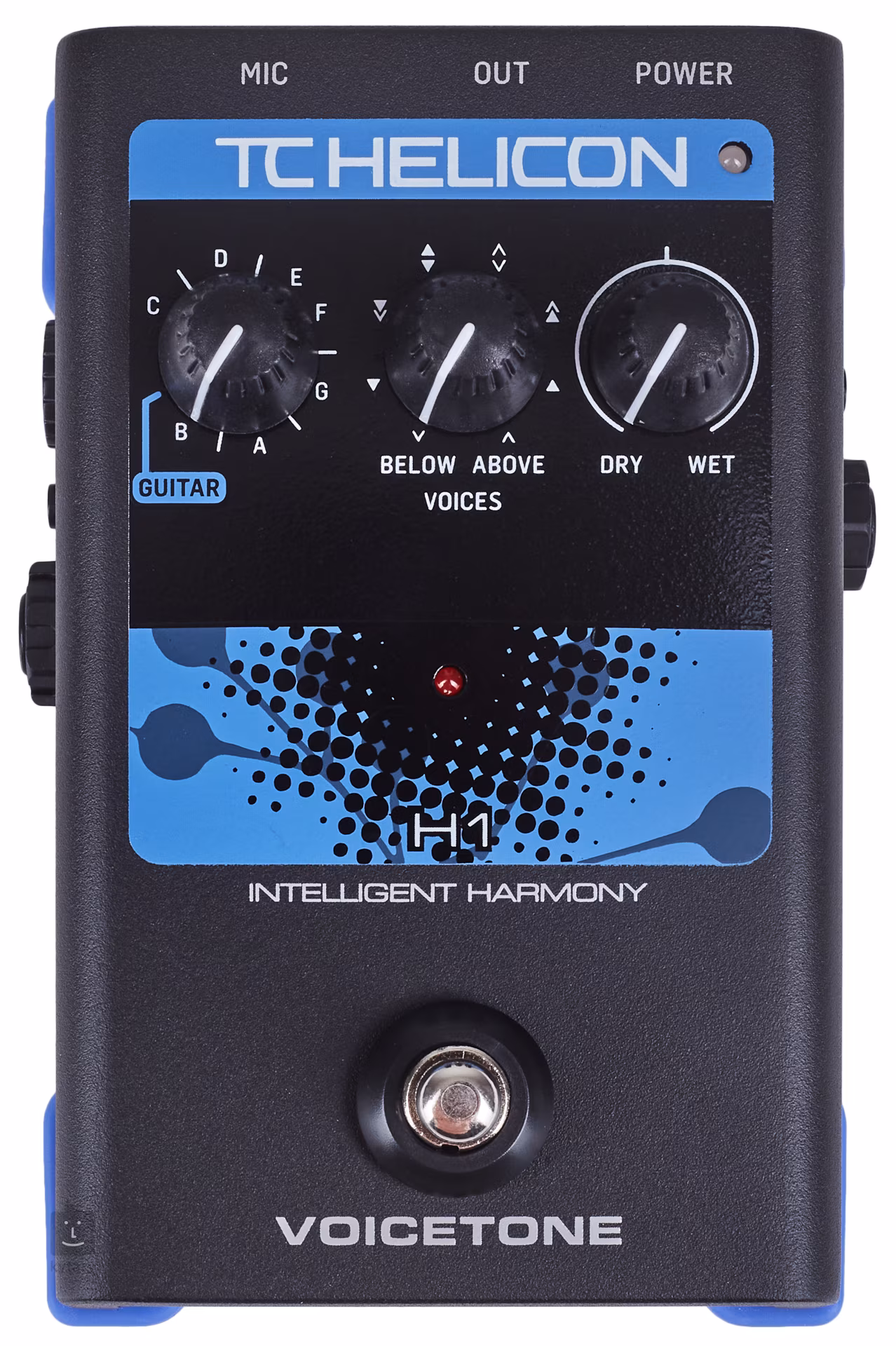 Les commandes sont très simples, le potentiomètre Voices permet de régler si vous souhaitez ajouter une voix de basse ou de tête à votre chant, le potentiomètre Dry/Wet règle l'intensité de la seconde voix. Si vous êtes accompagné d'un guitariste, laissez son signal se brancher par le H1 et la tonalité d'harmonie sera chargée automatiquement. Dans le cas contraire, vous devez entrer la touche manuellement.