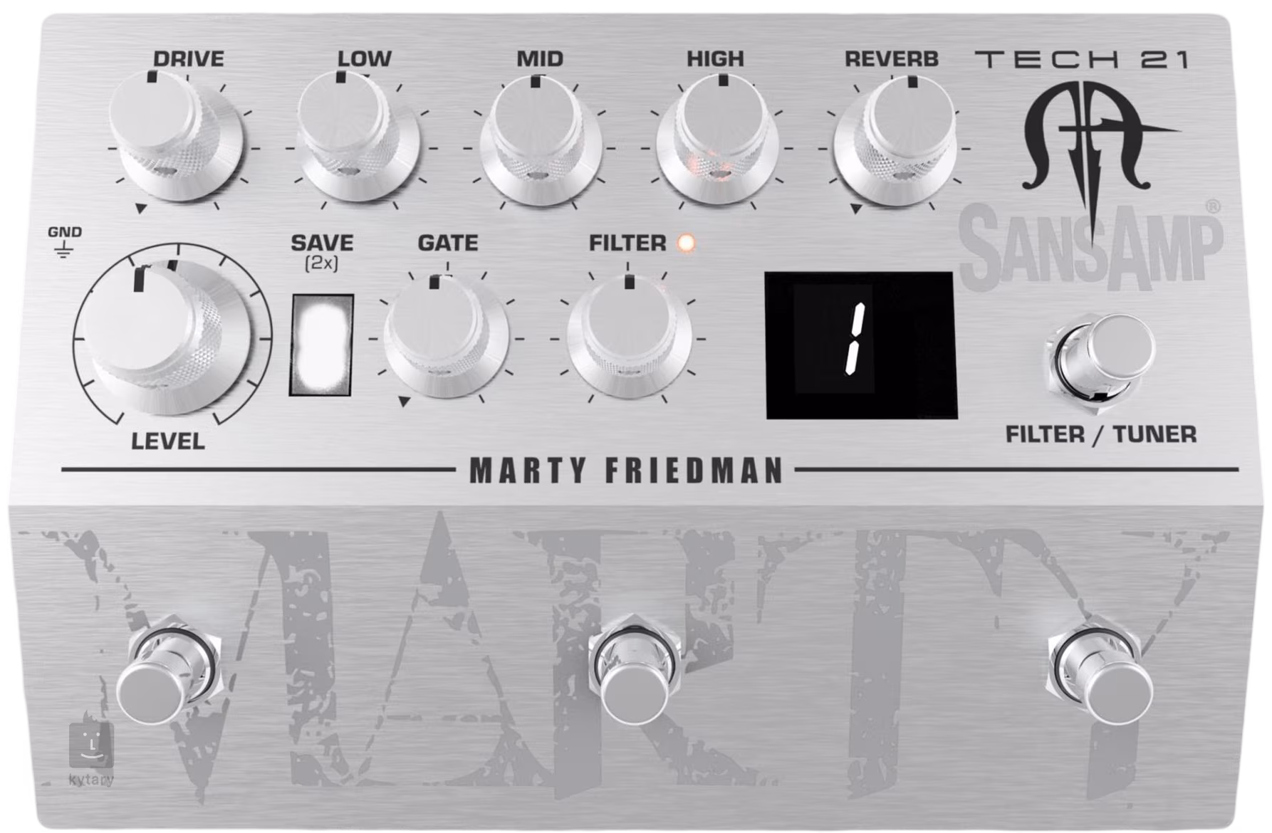 Le Marty Friedman Signature SansAmp offre deux modes de fonctionnement. En mode Performance, vous disposez instantanément de trois presets Friedman que vous pouvez personnaliser selon vos préférences, tandis que le mode Studio vous permet de stocker jusqu'à 128 presets utilisateur. Le contrôle de la pédale est intuitif et sa réponse est instantanée - en tournant les boutons, vous entendrez les changements en temps réel. Les fonctions d'édition sonore les plus importantes comprennent un noise gate, un égaliseur à trois bandes, une réverbération et, enfin, un filtre qui ajuste la forme d'onde du médium pour simuler au mieux le son caractéristique de Friedman. Un accordeur intégré est également inclus.