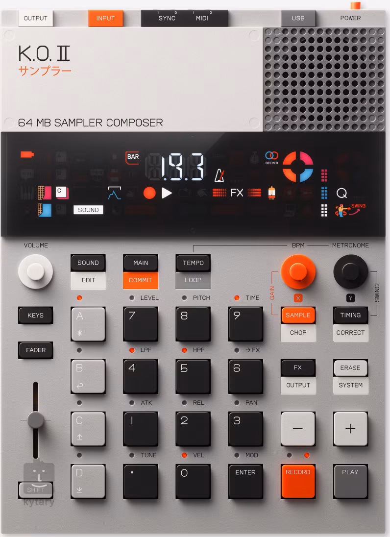 K.O. II dispose de 64 Mo de mémoire et d'un total de 999 emplacements disponibles pour divers échantillons. Le microphone interne pratique pour l'enregistrement de votre propre audio ainsi que le haut-parleur intégré sont plus susceptibles d'être utilisés en déplacement. Vous pouvez créer avec la boîte à outils typiquement étendue de Teenage Engineering. Environ la moitié de la mémoire de l'appareil est remplie d'échantillons préenregistrés. Vous pouvez travailler sur neuf projets différents, chacun contenant 4 groupes / 99 motifs. Les motifs comportent 12 pistes pour les échantillons et le MIDI, avec des séquences de longueur variable au sein des groupes (de 1 à 99 mesures). Il est possible de séquencer manuellement ou d'utiliser la quantification avec l'algorithme swing. La polyphonie atteint 12 voix dans le cas de la résolution MONO et demi, ou 6 voix dans le cas de STEREO. L'automatisation peut être enregistrée dans les 12 faders assignés. 12 pads sensibles au volume peuvent être assignés à l'un des 16 canaux MIDI. La fonction Slice permet de sélectionner manuellement des parties d'échantillons en temps réel ou par automatisation. Le traitement interne est en 32 bits, les convertisseurs AD et DA sont en 24 bits, et vous pouvez utiliser 6 effets d'envoi intégrés et un compresseur principal pour modifier le son.