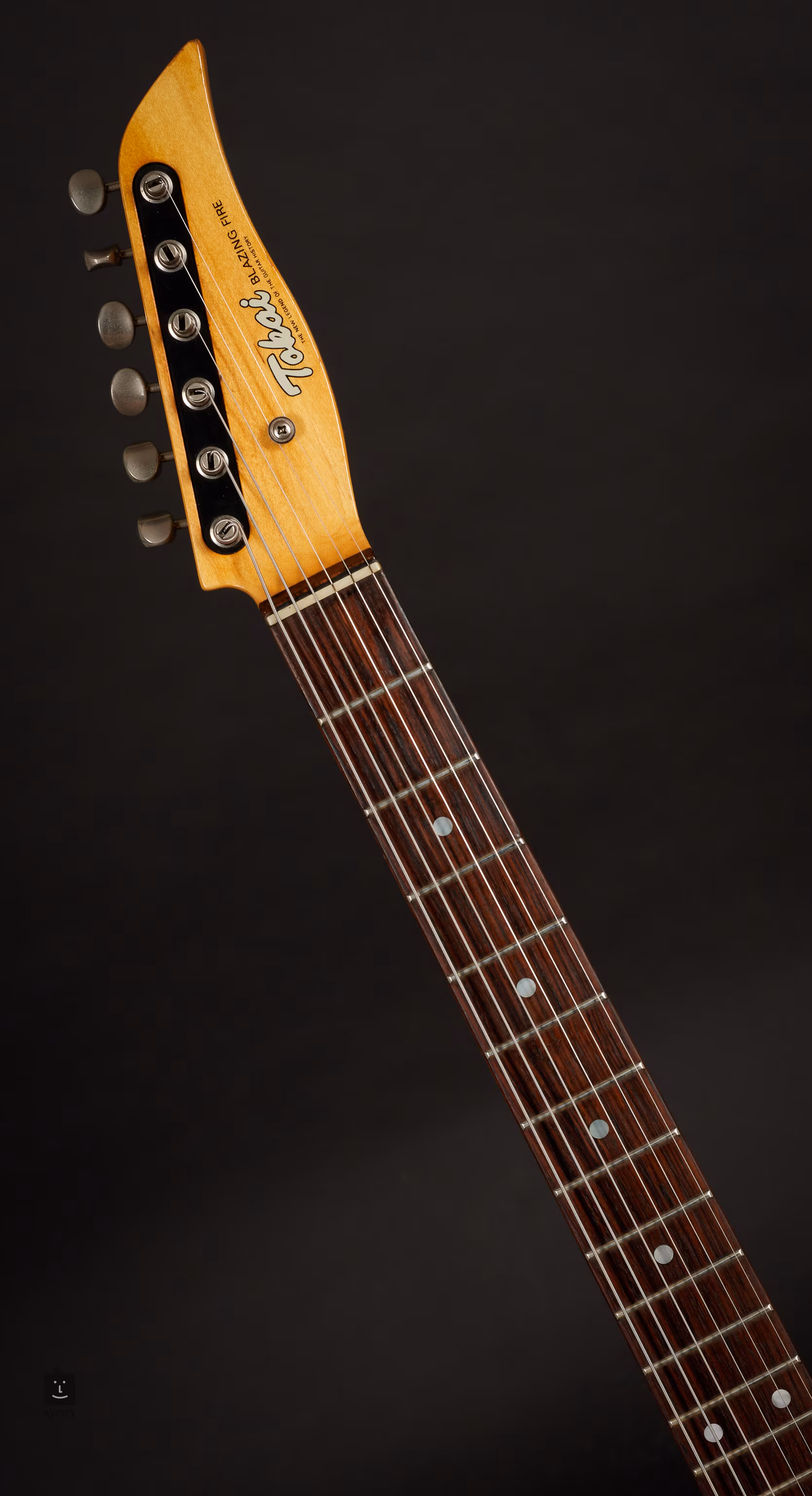La guitare japonaise Tokai Blazing Fire des années 1990 est le successeur du modèle Talbo original, dont le corps était en alliage d'aluminium. Cette rare réédition de la forme originale a un corps en bois, peint en rouge métallisé.