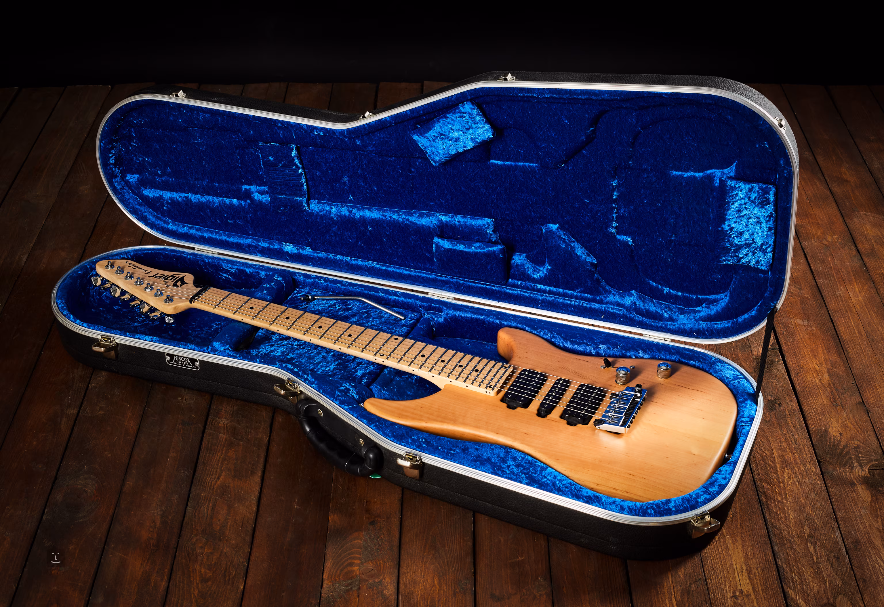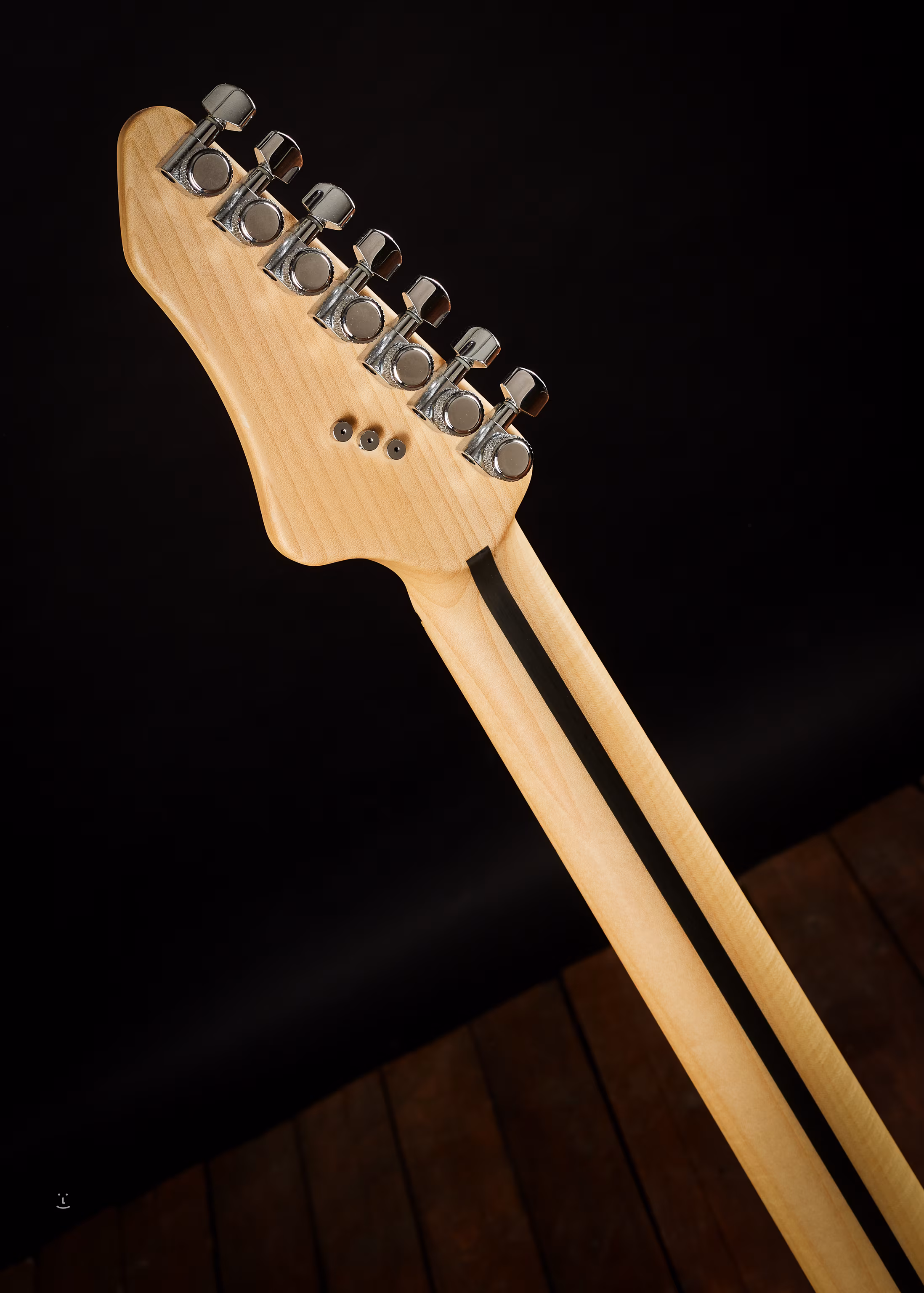 Le manche en érable est, comme il est d'usage chez cette marque, renforcé par une large entretoise en composite. Le corps en aulne en deux parties est verni avec une fine laque dans une finition naturelle.