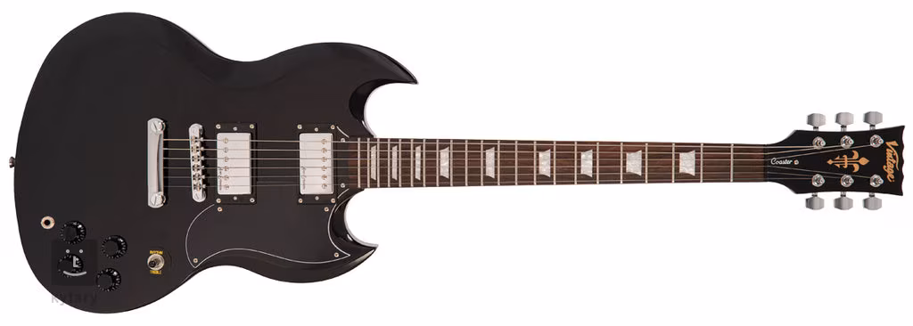 La Vintage V69 Coaster Series Gloss Black est une guitare électrique de la forme à double coupe de la populaire "Esga". Le corps de l'instrument est en tilleul. Une touche en palissandre avec vingt-deux frettes est collée sur le manche en érable.