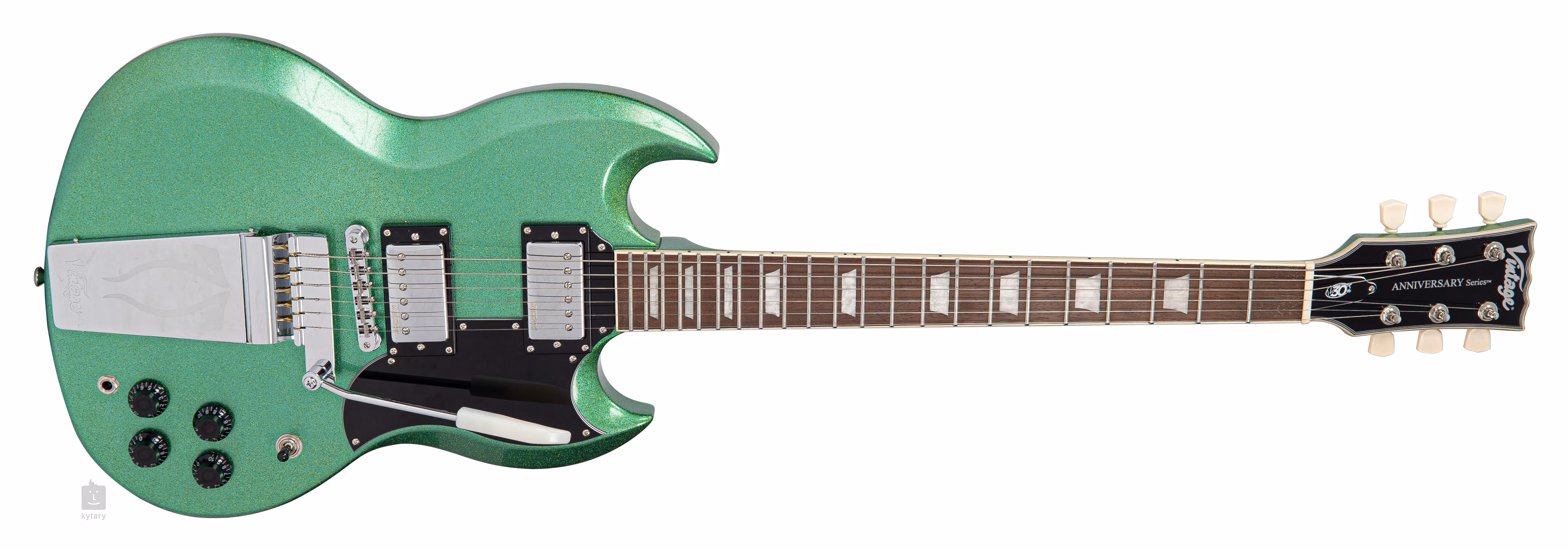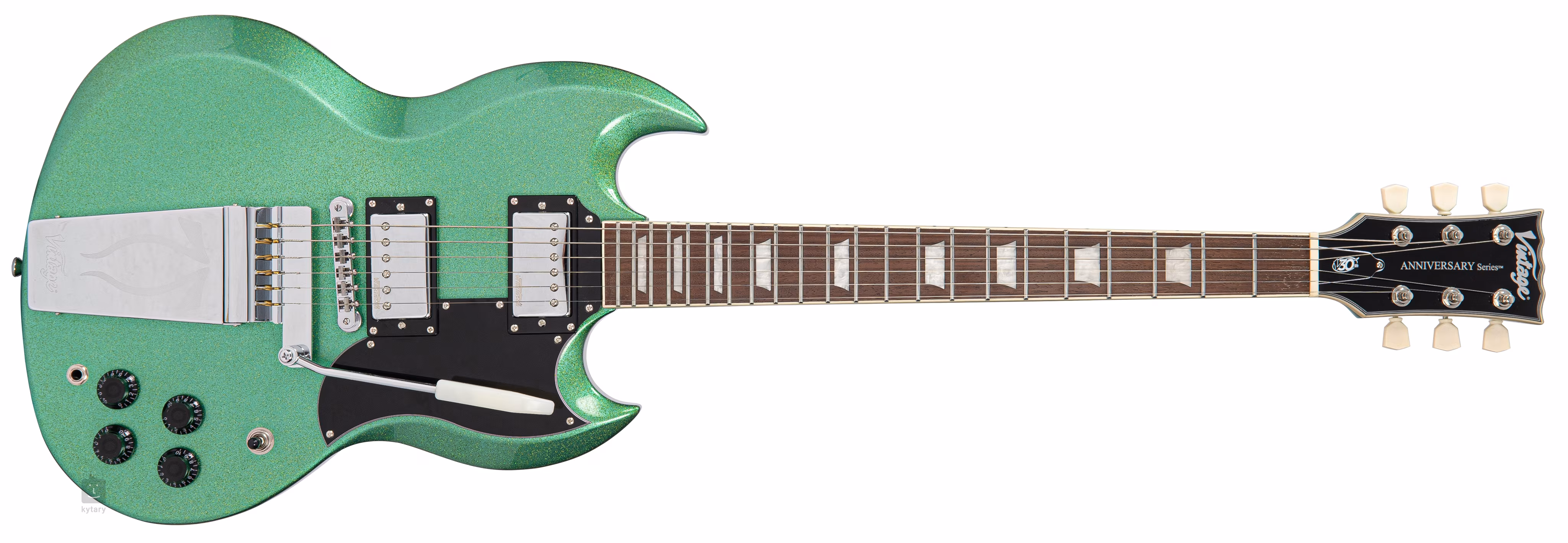 La guitare électrique VS6V Green Metalflake 30th Anniversary au design SG à double coupe fait partie d'une série limitée célébrant le 30e anniversaire de la marque britannique Vintage Guitars. Et un tel 15e anniversaire multiplié par deux se doit d'être célébré comme il se doit.
