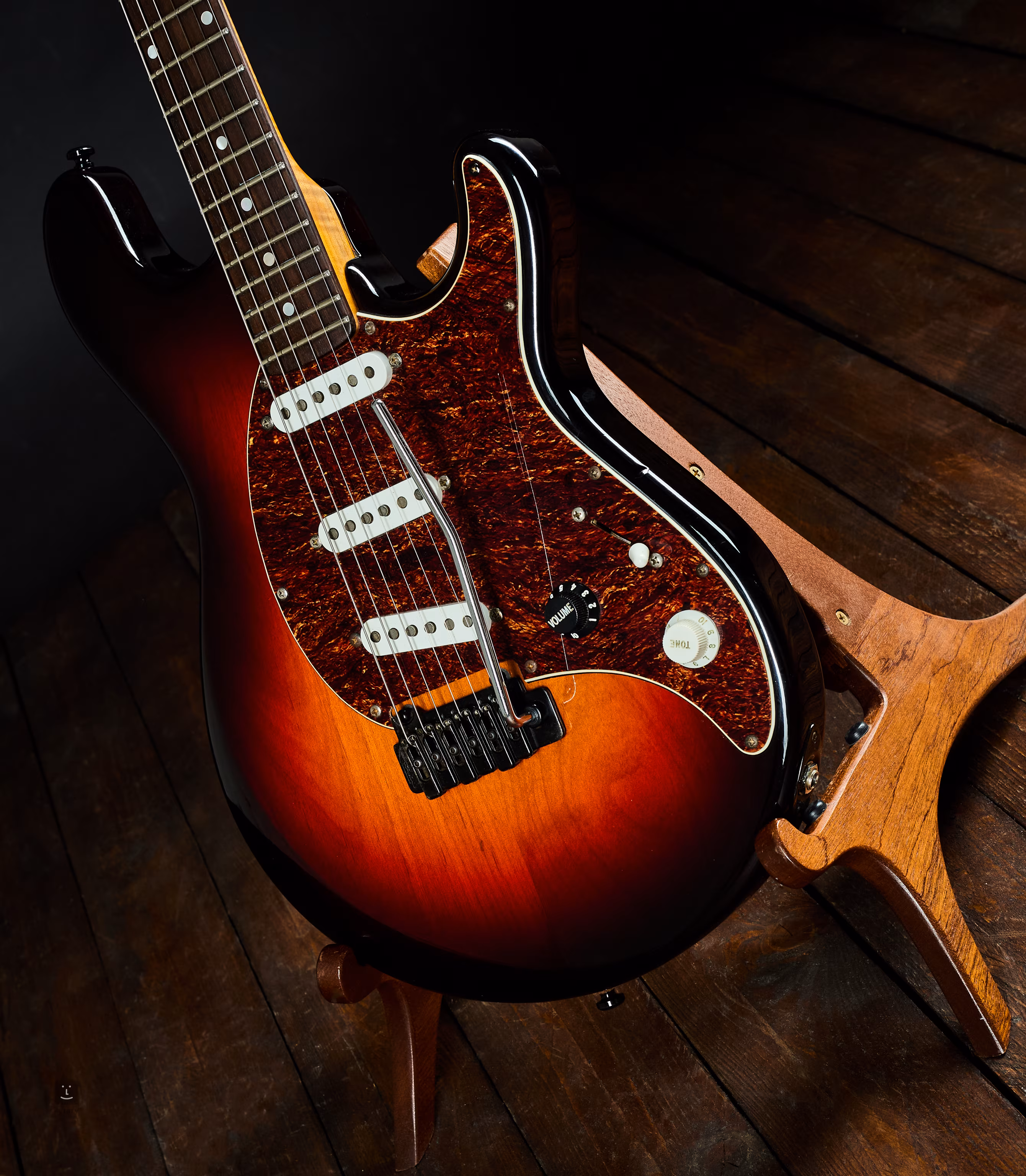 Le trémolo moderne à simple bobinage est maintenu par deux pivots ; les micros sont des Fender Custom Shop (malheureusement, pas de désignation spécifique, mais vraisemblablement un jeu de Texas Special singles). Les mécaniques Sperzel sont à verrouillage.