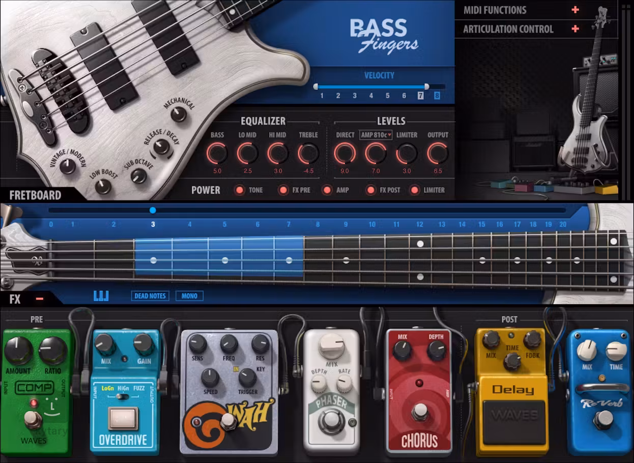 Simulation réaliste de guitare basse L'instrument virtuel Bass Fingers reproduit le son et la chaleur naturelle d'une guitare basse jouée au doigt. Les 14 000 échantillons comprennent plusieurs couches dynamiques, un sustain naturel et une rotation des notes "round robin". Choisissez la position du manche pour jouer les notes, car la même note a des sonorités différentes selon l'endroit où elle est jouée. Le fait de changer de touche ajoute de l'articulation sous la forme d'échantillons legato, de glissades haut/bas, de divers sons naturels mais non musicaux, de hammeron et bien plus encore. Bass Fingers est extrêmement naturel et réel.