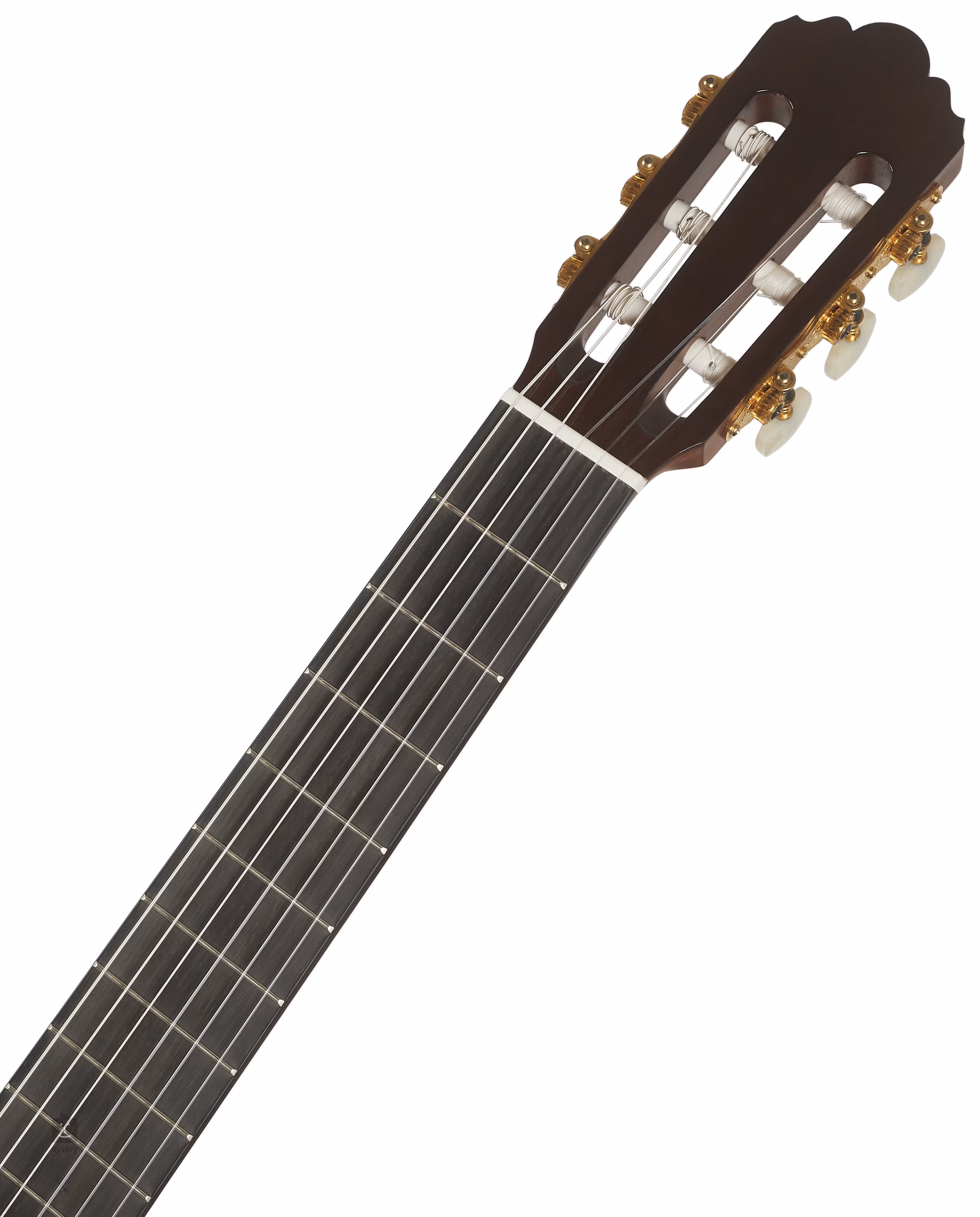 Le corps de cette guitare est fabriqué en cèdre rouge massif et en palissandre massif pour le dos et les éclisses. Cela donne à la guitare un son chaud et équilibré, et la solidité du corps signifie qu'elle se bonifiera au fil des ans. Elle est également dotée d'un manche en acajou africain, d'une touche en ébène, d'une touche en palissandre, d'une mécanique ouverte classique en finition dorée et de touches décoratives traditionnelles sous la forme de filets et de rosaces.