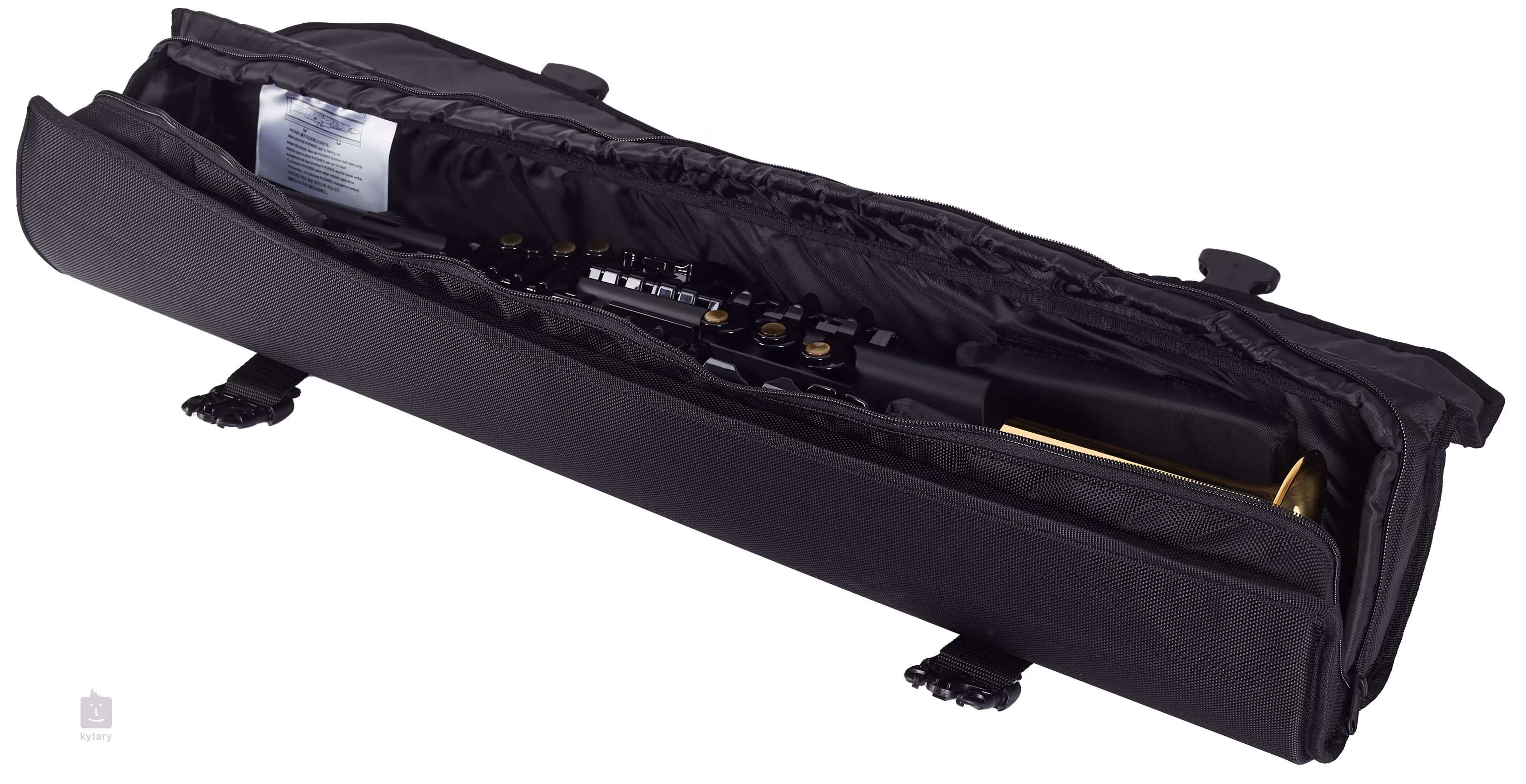 Le saxophone numérique est livré dans un étui souple avec une sangle et un jeu d'accessoires pour le bec (bec YDS, tranche, ligature, chapeau). L'instrument peut etre alimenté par des piles (4x AAA Alkaline ou piles Ni-MH rechargeables) ou par USB 5V/1A (micro USB Type-B).