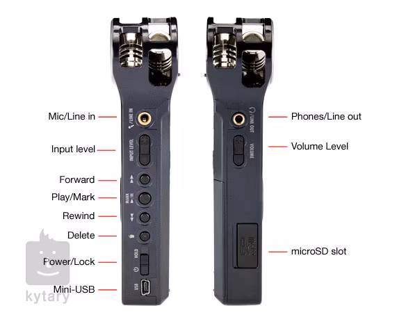 On the back, you’ll find a single AA battery compartment, a tripod mount, low cut filter, auto level setting and recording format selectable switches. There’s also convenient mount for a strap or lanyard clip.